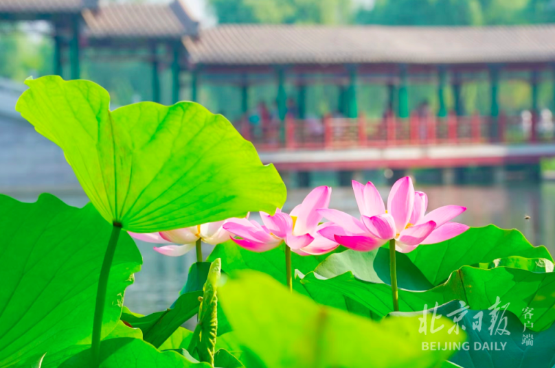 7月2日,通州区西海子公园内,近日悄然绽放的荷花,花姿婀娜、清新明朗,池中荷花和燃灯佛舍利塔交相辉映,站在曲云桥凭栏眺望,锦鲤围绕着荷花的倒影,追逐嬉戏,市民游客或湖畔驻足,或亭榭小憩,欣赏独特荷韵,消暑纳凉,别有一番滋味。