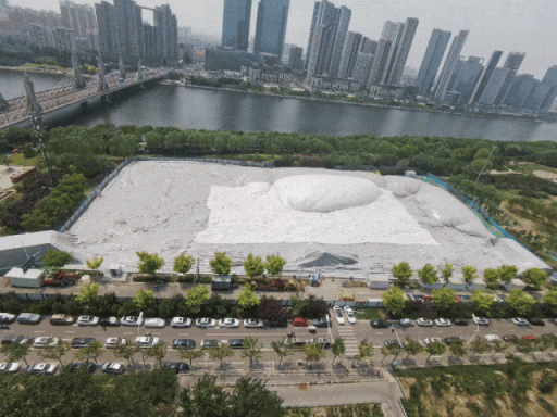 这是今年通州区新增海绵城市工程施工工地罩上的“气枕式”充气膜。