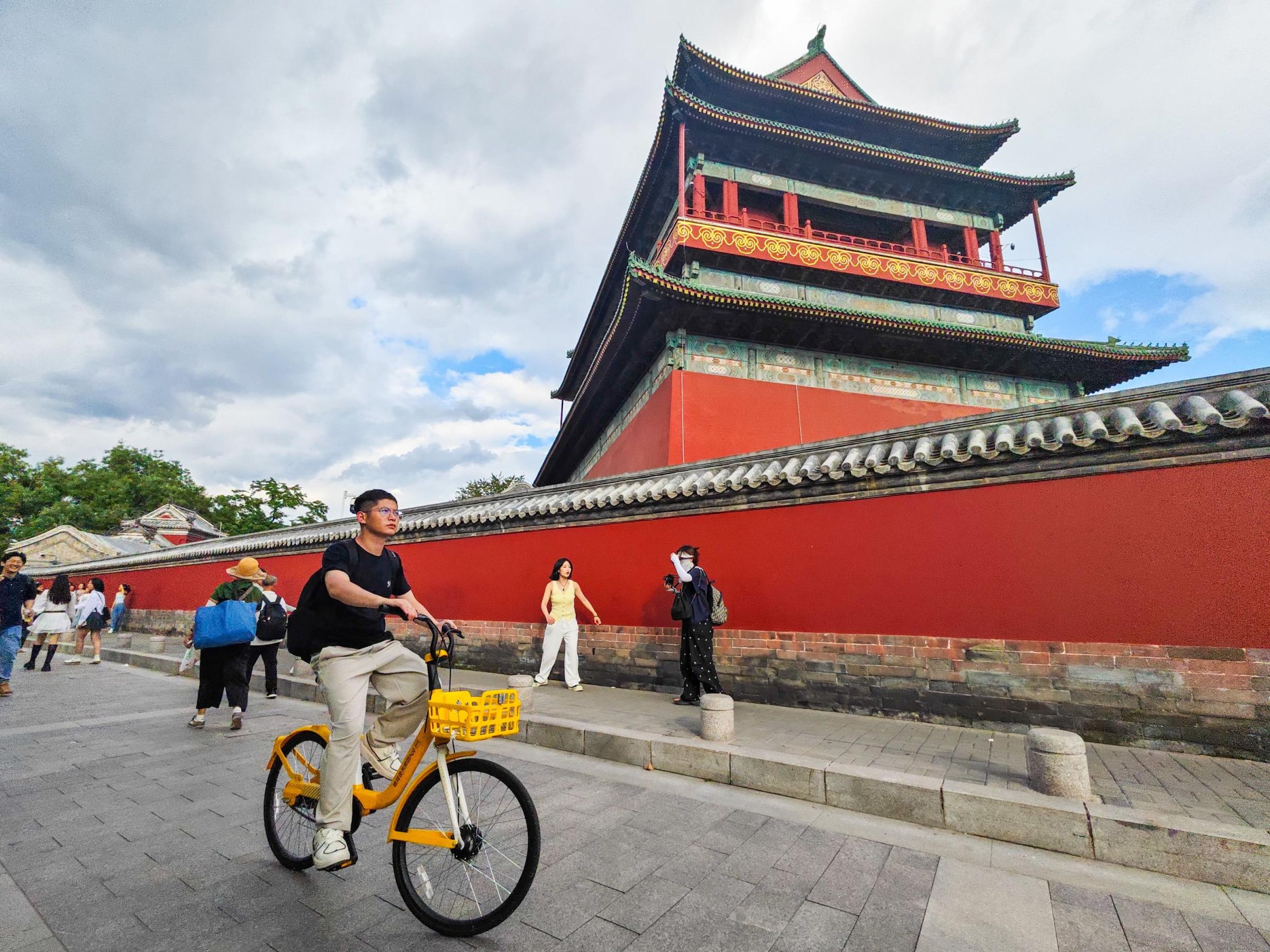 游客在中轴线鼓楼周边骑车游玩。邓伟摄