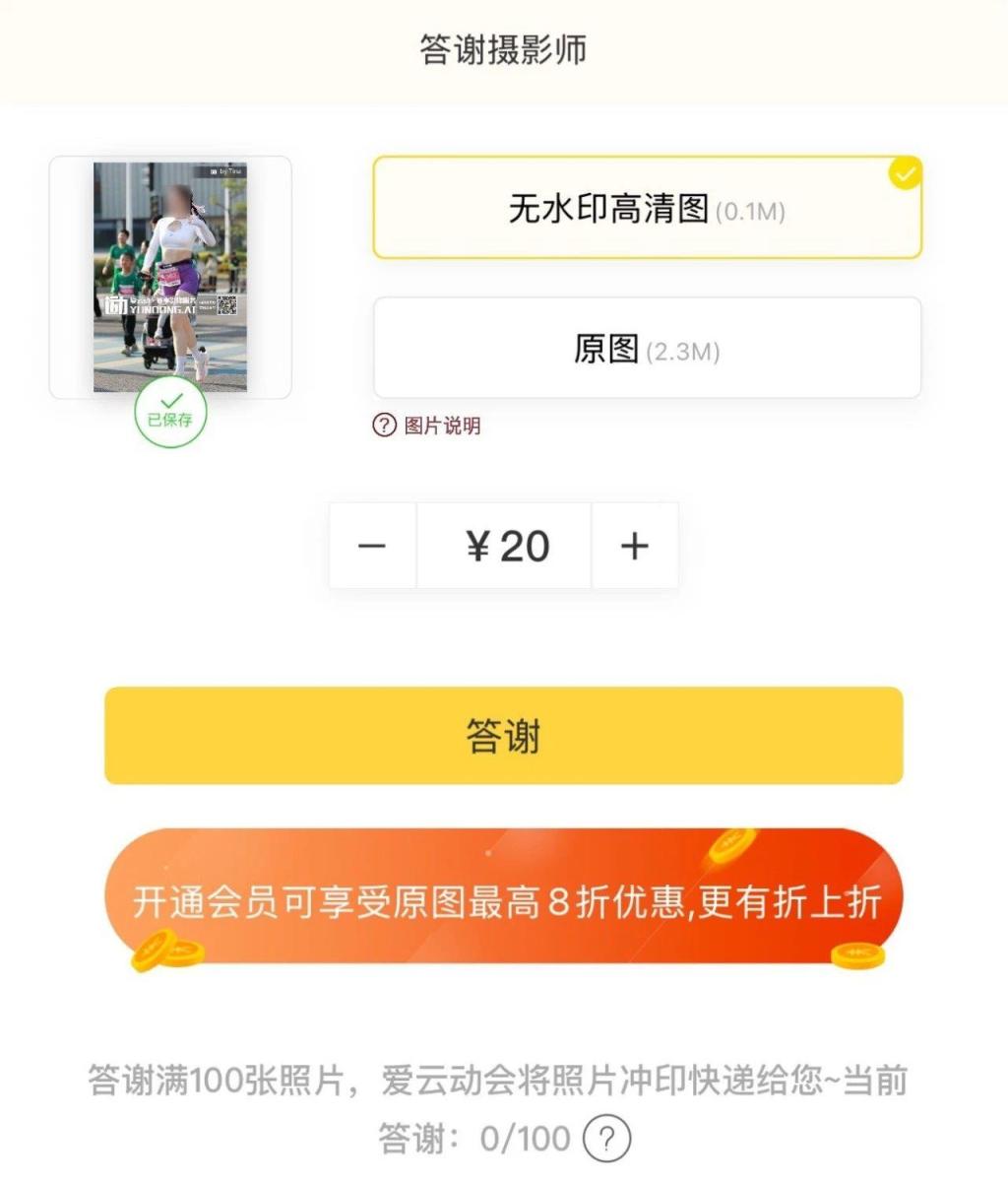 记者在“爱云动”平台上,找到不久前在广东某地举行的马拉松比赛,看到有55万多张高清照片。记者随机点开一张跑者照片,花费20元即可下载无水印高清图。