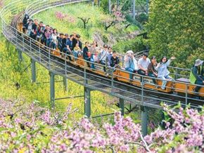 浙江省湖州市长兴县和平镇城山沟景区,游客乘坐观光小火车徜徉花海。谭云俸摄(人民视觉)