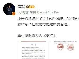 6月27日晚,小米创办人、董事长兼CEO雷军在其个人微博表示,小米YU7取得了了不起的成绩,我们特别高兴。我的家乡是湖北仙桃市,第一时间就收到了仙桃市委市政府的贺信。真心感谢家乡人民支持!