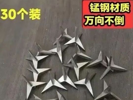 “扎胎钉”,又被称为“三角刺钉”“四角钉”或“铁蒺藜”等,是一类由钢材制成、带有多个尖角或锐刺的金属器件。常见结构为双三角形铁片拼合而成,具有一定重量与锋利度,其设计特点在于随意抛撒后总有一面尖刺朝上。
