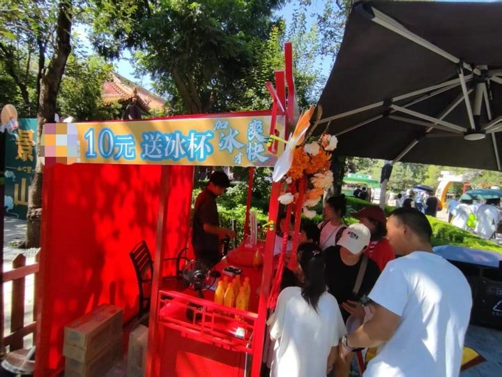 再往公园深处走,游客开始渐渐分散,同质化就不再容易吸引消费。景山西侧一个小卖部,售卖品类与南门一致,但客流明显变少。再往西门走,一个很小的冷饮摊位,在更少的游客密度中却制造了排队现象。有游客一手汽水一手冰杯,“十块钱一瓶桔汁汽水,另外送一杯冰块。冰块太有用了,凉快。”相对于单纯的售卖,这算是提供了一些精细服务。与这个冷饮摊位相比,西门附近其他的零售点,就略显落寞。一个文创用品摊位,其冰箱贴的精美程度完全不输南门文创店,但因游客密度小、差异化不明显,而显得冷清。