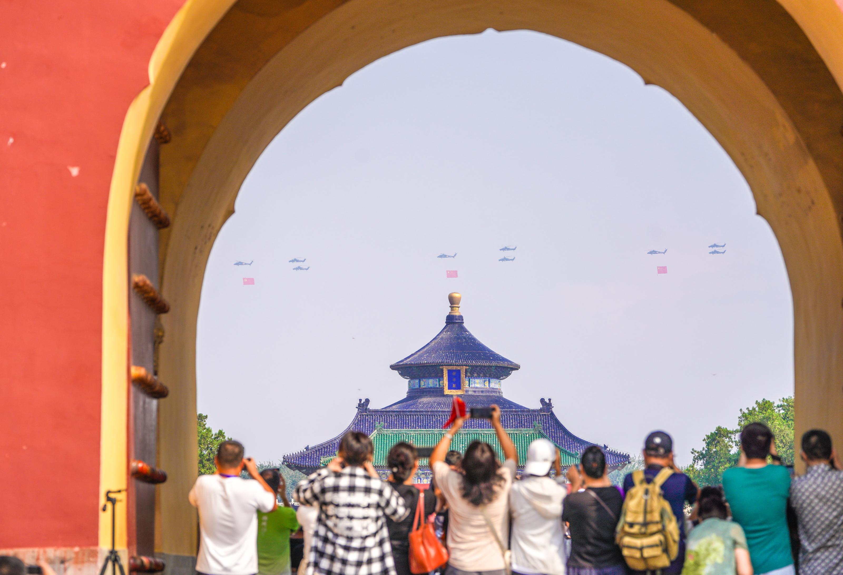 市民在天坛公园见证空中梯队经过。
