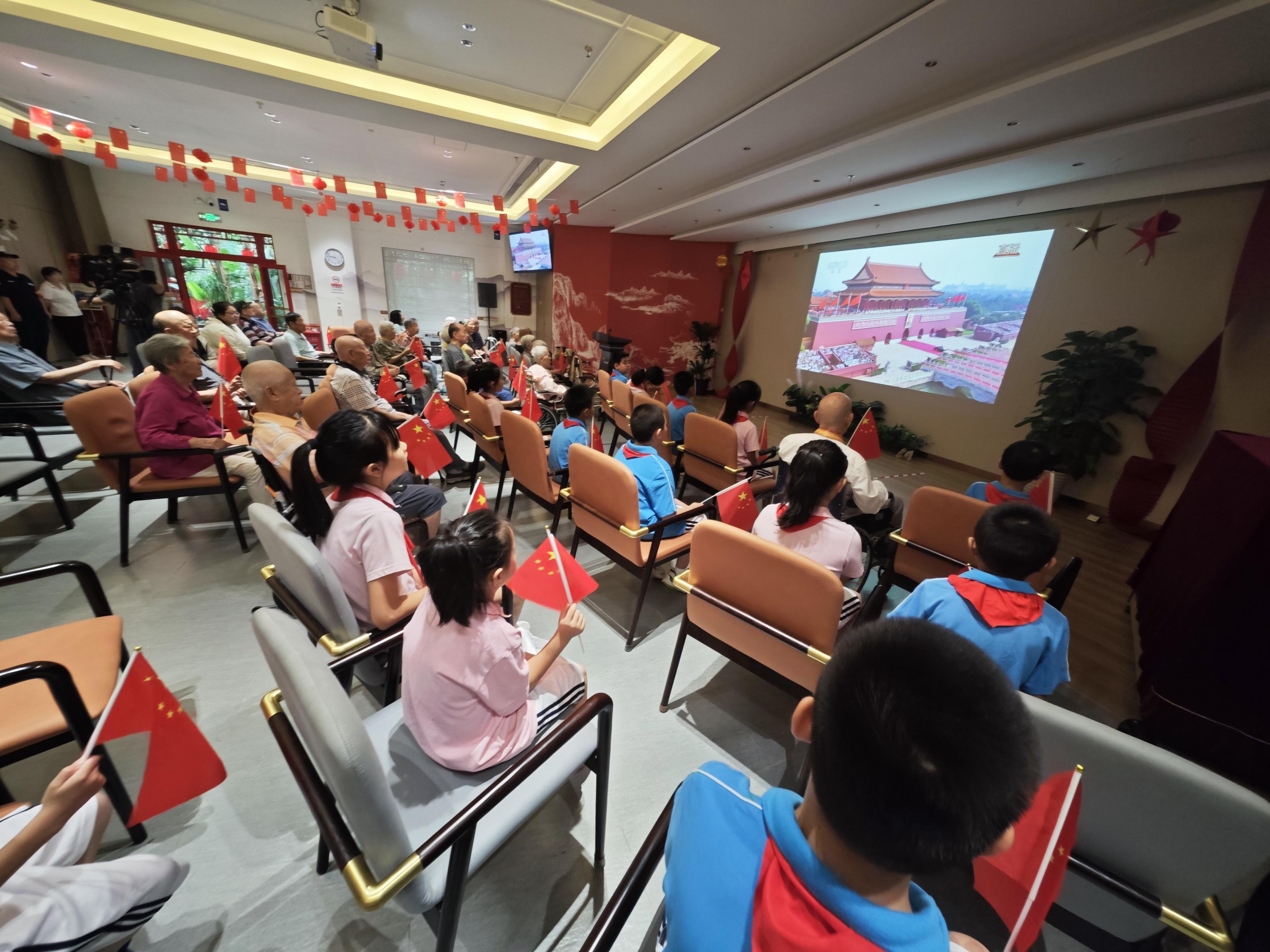 石景山区电厂路小学的学生来到寿山福海养老服务中心,同生活在这里的抗战老兵一同观看纪念中国人民抗日战争暨世界反法西斯战争胜利80周年阅兵式。