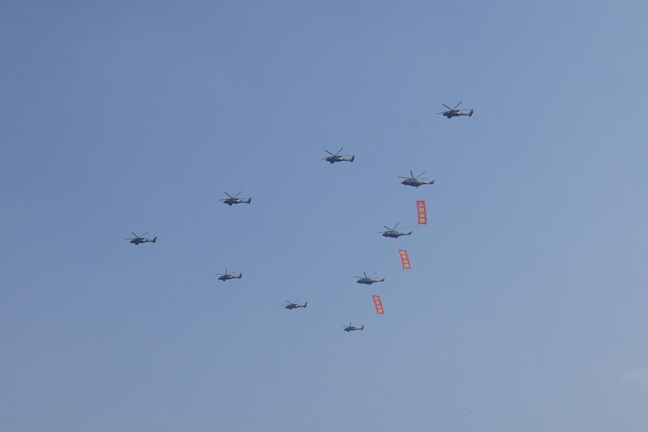 空中护旗梯队经过天安门广场上空。
