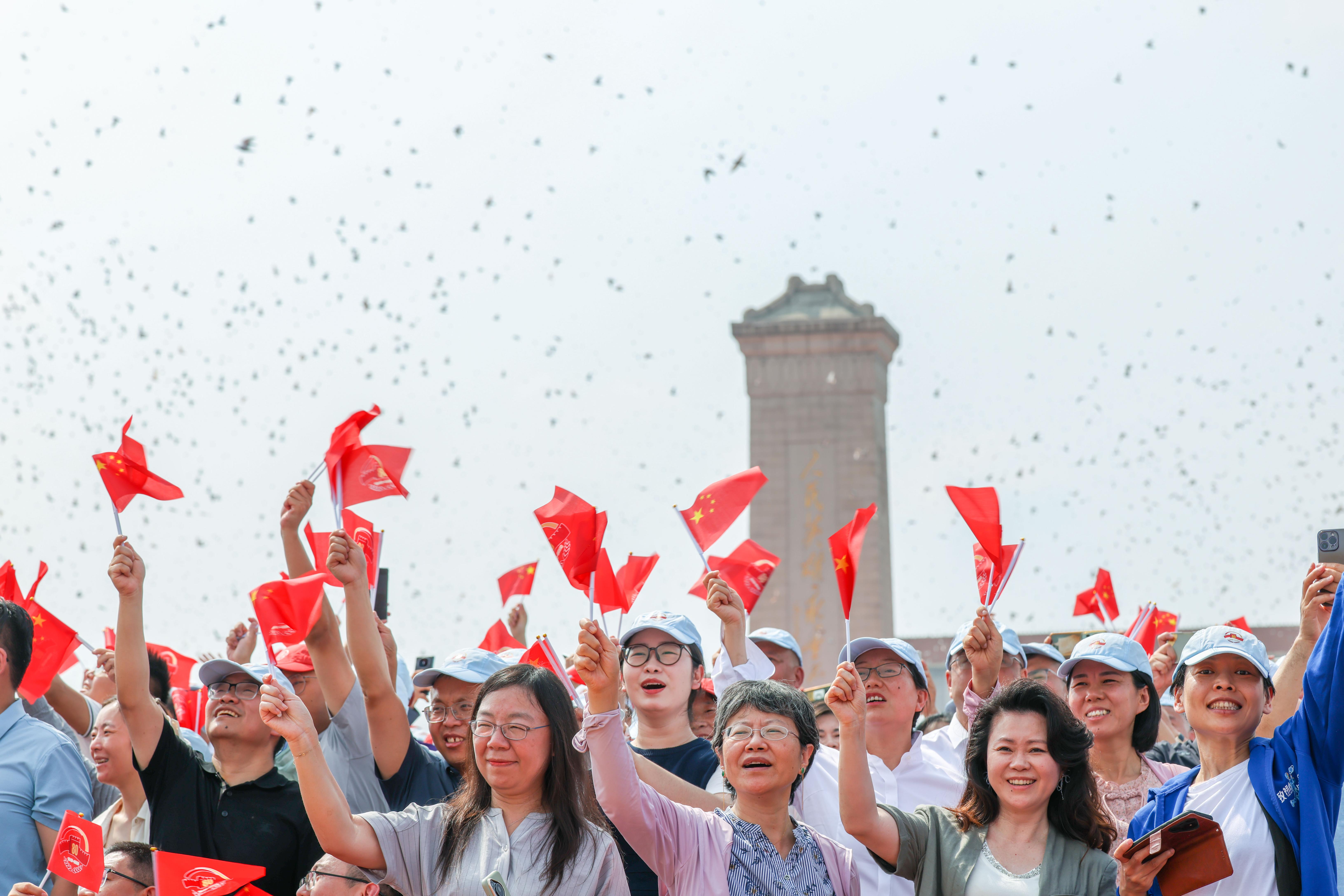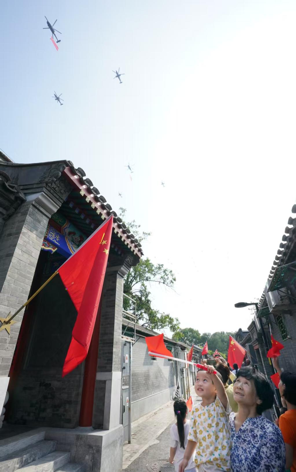 京城西交民巷古巷上空,空中梯队数架战机编队呼啸而过,拖曳的彩色烟带如绚丽长虹,划破天际。居民们挥舞国旗,或举手机、相机记录,欢呼声、赞叹声交织。