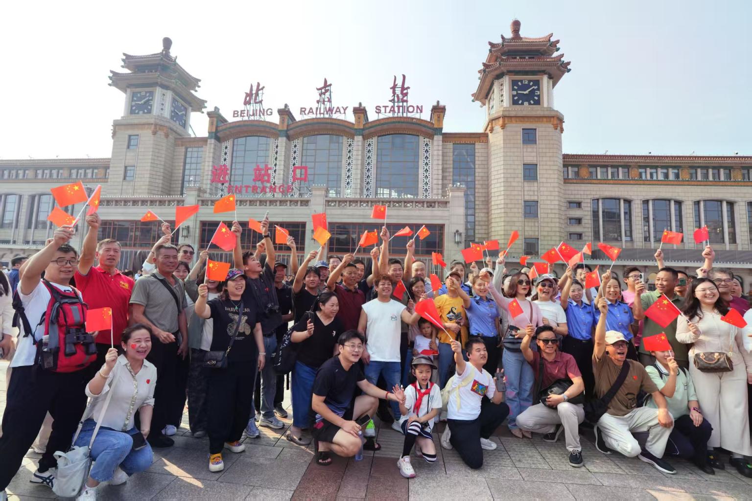 北京站前广场,北京站工作人员免费为旅客发放国旗,旅客拍照留念。