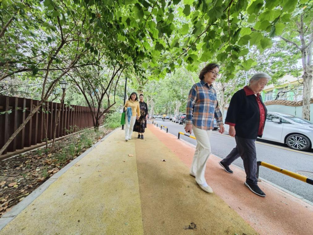 除了风雨连廊,社区还利用空地翻修了多个凉亭,新建了带按摩轴的座椅。人行道由水泥路面升级为塑胶材质的“彩虹步道”,红黄橙三色相间,不仅平整了坑洼,行走体验也更好。路边设置了低矮路障,防止机动车占道影响老人通行。