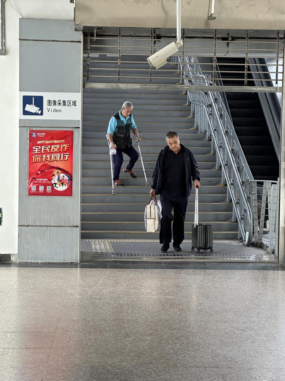 在1号线四惠地铁站A口,没有无障碍直梯,要想从其两侧进站,只能费力爬上40多级台阶,虽然西侧设置了无障碍爬楼机,但老人普遍不愿“麻烦”。而若是要从对面的公交枢纽过天桥进地铁站,只能是“坐扶梯上,走楼梯下”,且楼梯两侧也无适配的扶手,老人只能勉强扶住爬楼机的轨道,缓慢移动。