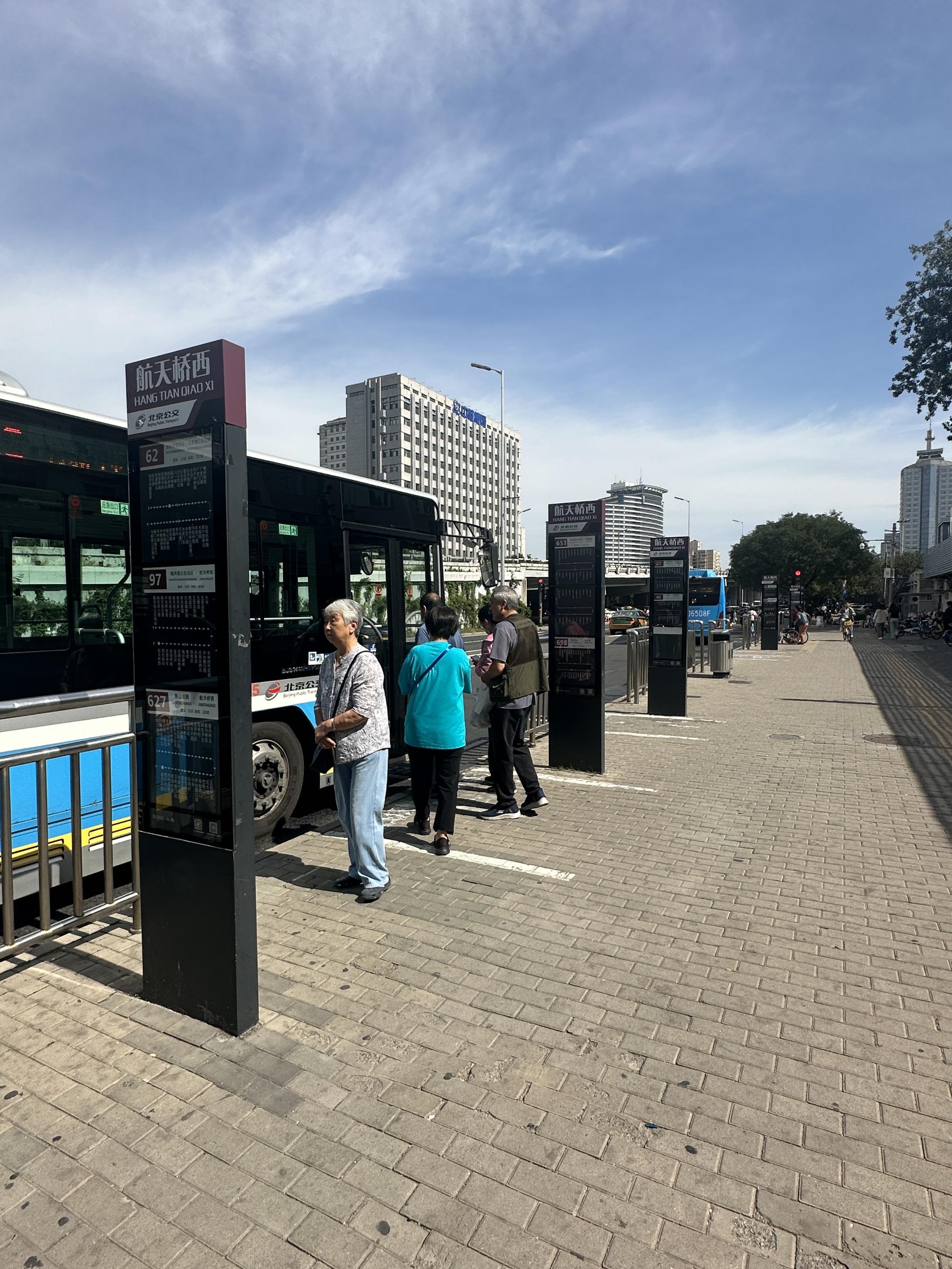 阜成路辅路南侧的航天桥西公交站,有20多趟公交线路在此经停,这里东侧设置了6块公交站牌,每一块站牌代表不同线路的等待点,但站台的4组候车厅却全设置在西侧,距离东边最远的一块站牌将近40米。中午太阳正烈时,从空军总医院看病出来的老人,只能在东侧站牌旁暴晒等待,或退到后方平房的阴凉下躲避。“多数线路都在东边停,要是在西边的候车亭下等车,车来了,我这腿脚哪能跑得过去呢?”80岁的吴大爷提着药袋,在太阳下晒得额头上满是汗珠。
