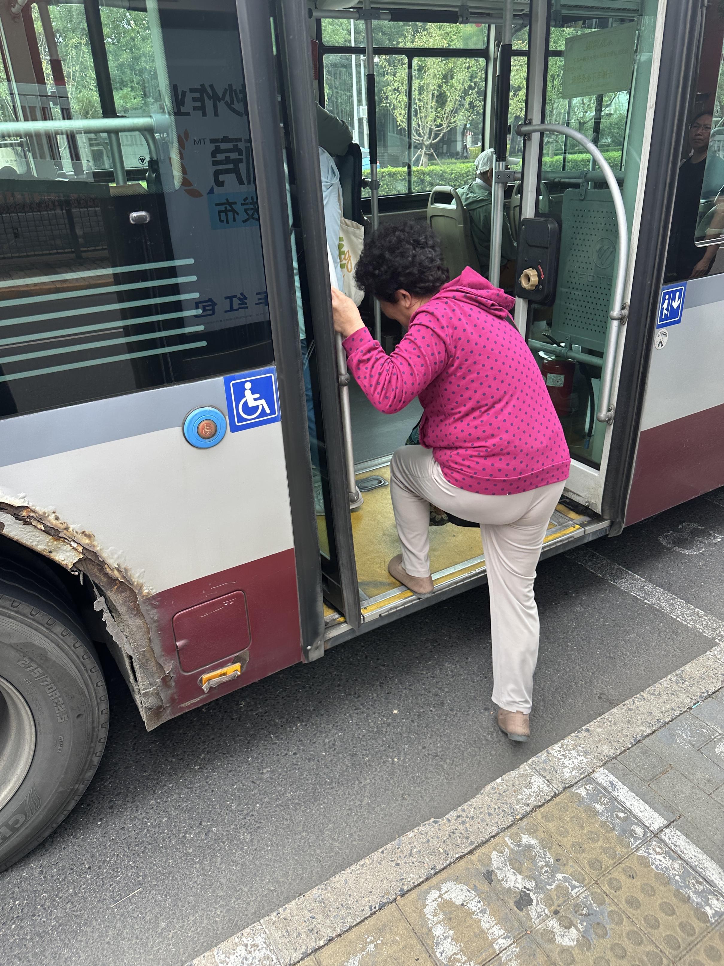 对于更常坐的公交车,乘车时能够“一步登车”是许多老人的愿望。但记者在部分公交站观察时,发现老人的这个愿望有时也会落空。在圆明园西路北口站,10趟进站的公交车中,有七八辆停靠在距离公交站台目测40厘米以内,平均步幅在30厘米至40厘米的老人大多可以实现“一步登车”,但有的司机停车速度快、急刹车且停在离站台半米之外,对一些腿脚不便的老人来说,上车就很费劲。这里的站台高20厘米,老人需先下站台,再扶着车门把手用力一蹬上车,“这一下一上,膝盖得用两次力。我们理解司机辛苦,但能不能多为老人想想,停得再近一点、慢一点?”69岁的李大妈期盼着。