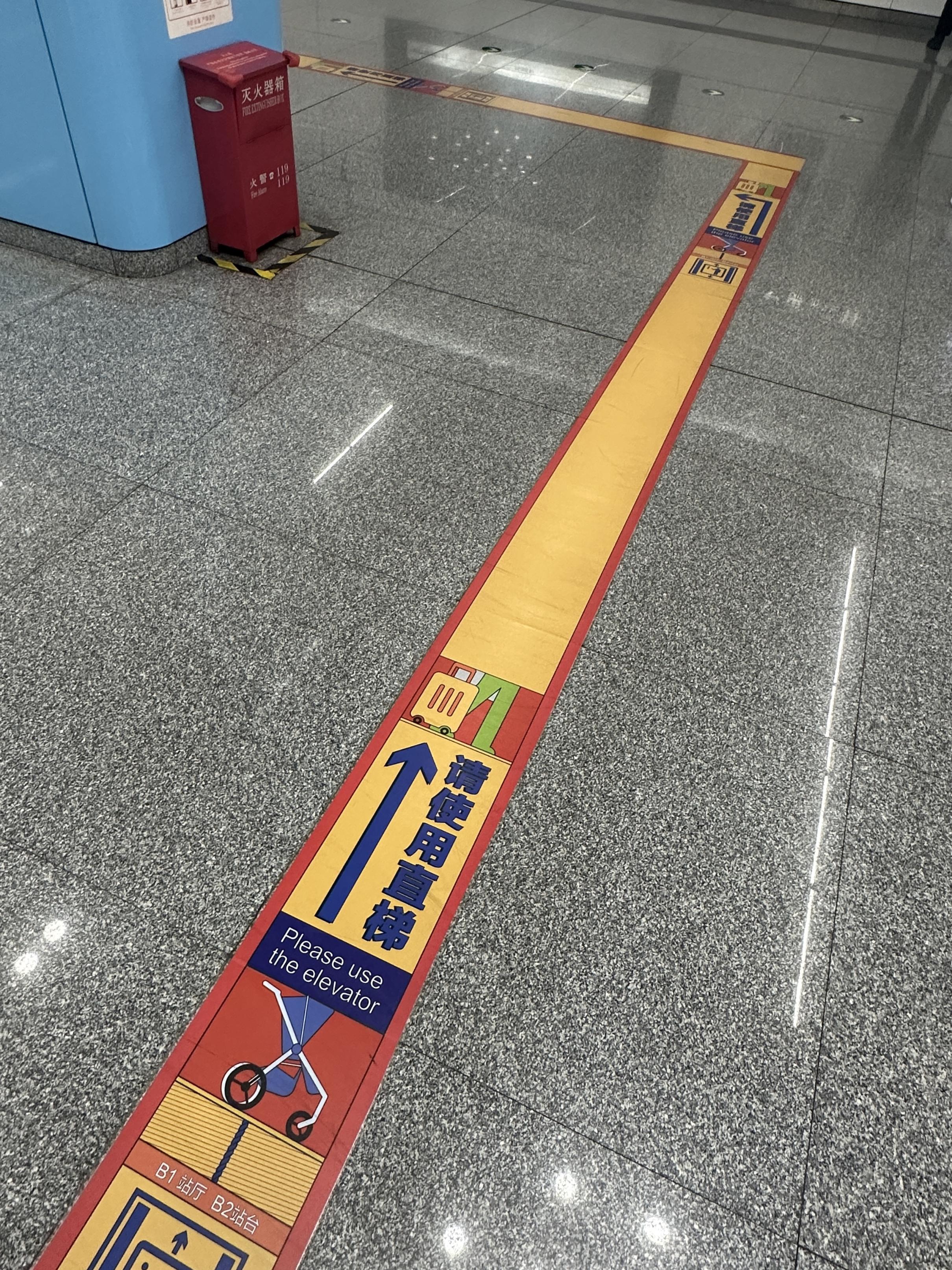 不过,记者发现,有些地铁站的标识方式很值得借鉴。例如14号线的北工大西门站,不仅墙上、头顶有直梯标识,从站台到站厅,地面都有连贯的动线指引着直梯的方向和位置,老人只要跟着地上的指示箭头一直走,就可以顺利找到。