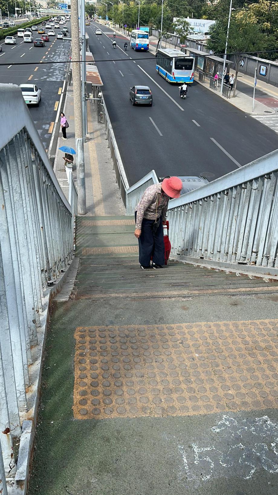 更关键的是,天桥上的细节设计很不适老:天桥台阶两侧无高度合适的连贯扶手,约1.2米高的栏杆让矮个子老人难以借力,从路面到天桥的台阶中间仅有的斜坡还常被不守规矩的外卖车占用,老人拉着菜车上下时,不仅费力还面临碰撞风险。甚至,从天桥下到站台的台阶处都没有设置坡道,更让拉着车的老人举步维艰。