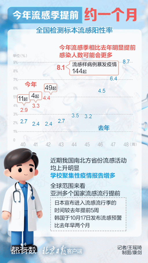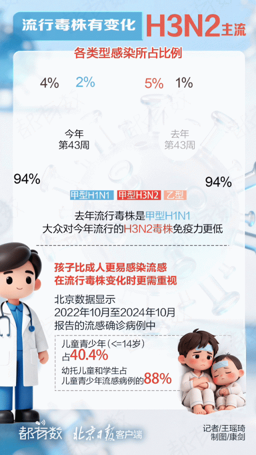最新披露数据显示,2022年以来两个流感季北京报告的确诊病例中,儿童青少年占比超四成。目前正处于流感活动上升期,今年流感会比之前更严重吗?流行毒株发生了什么变化?家有儿童请尽快接种疫苗!