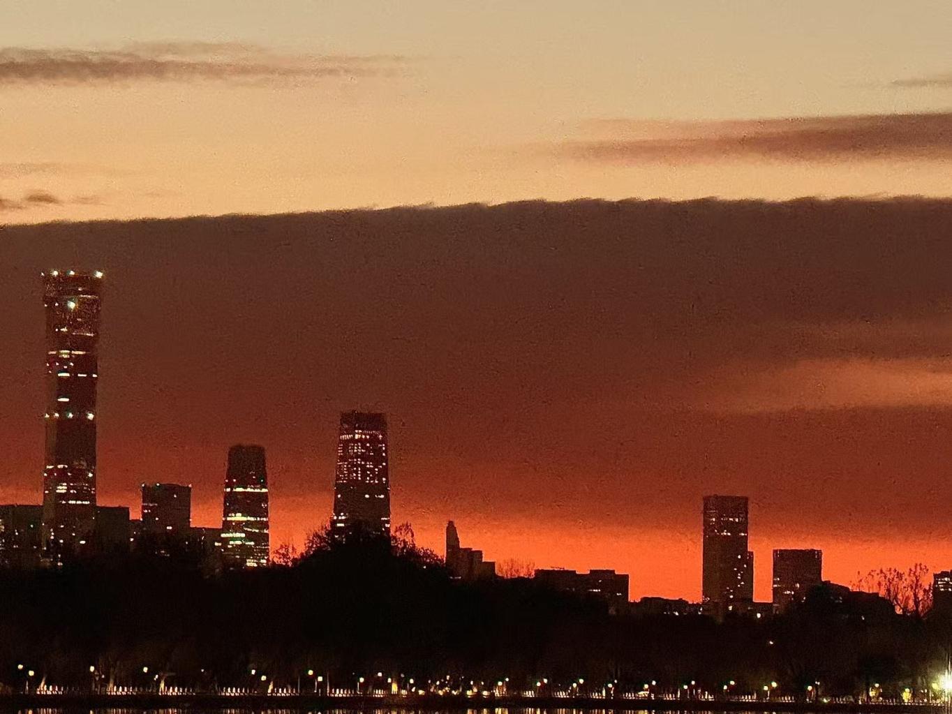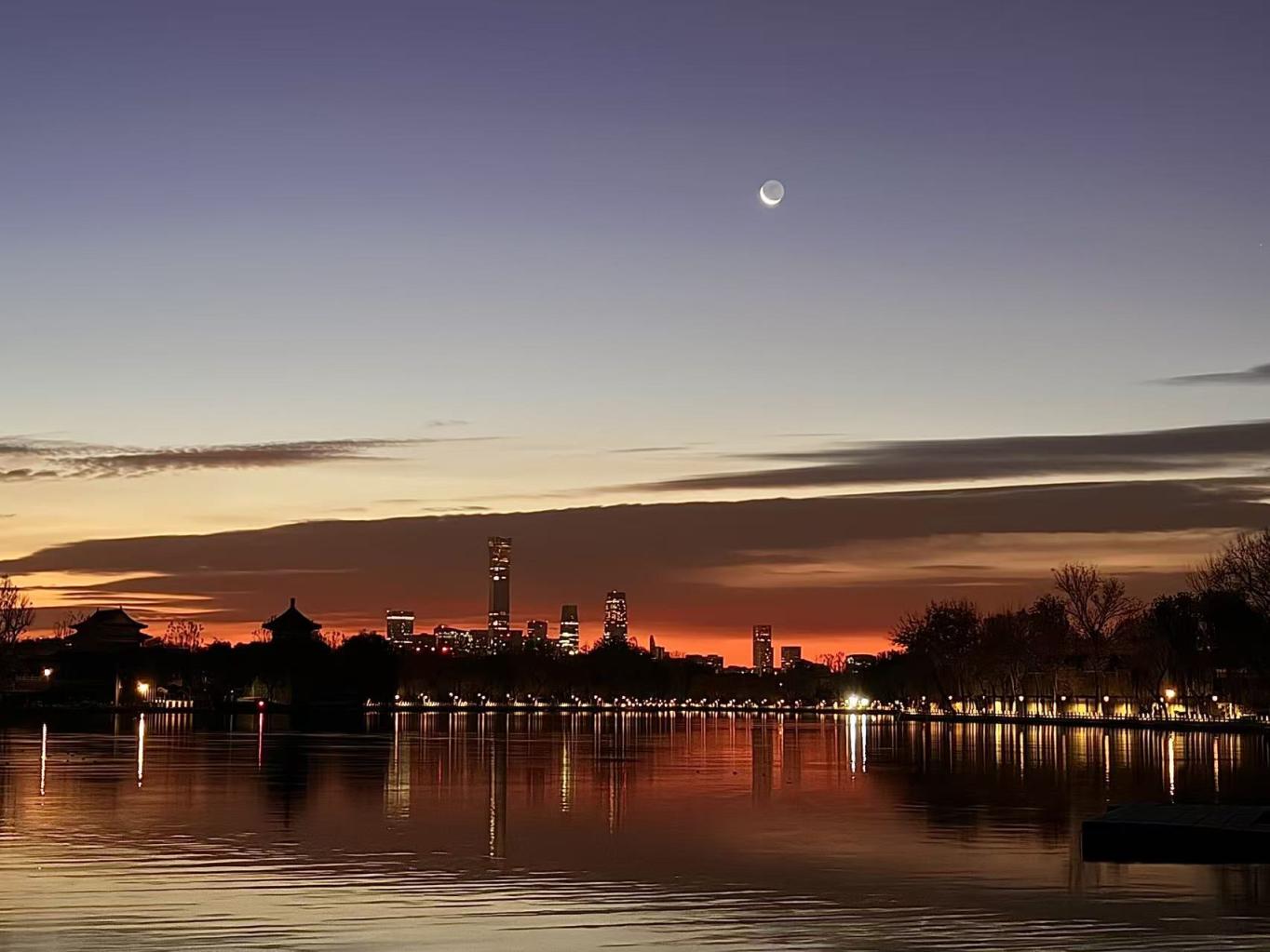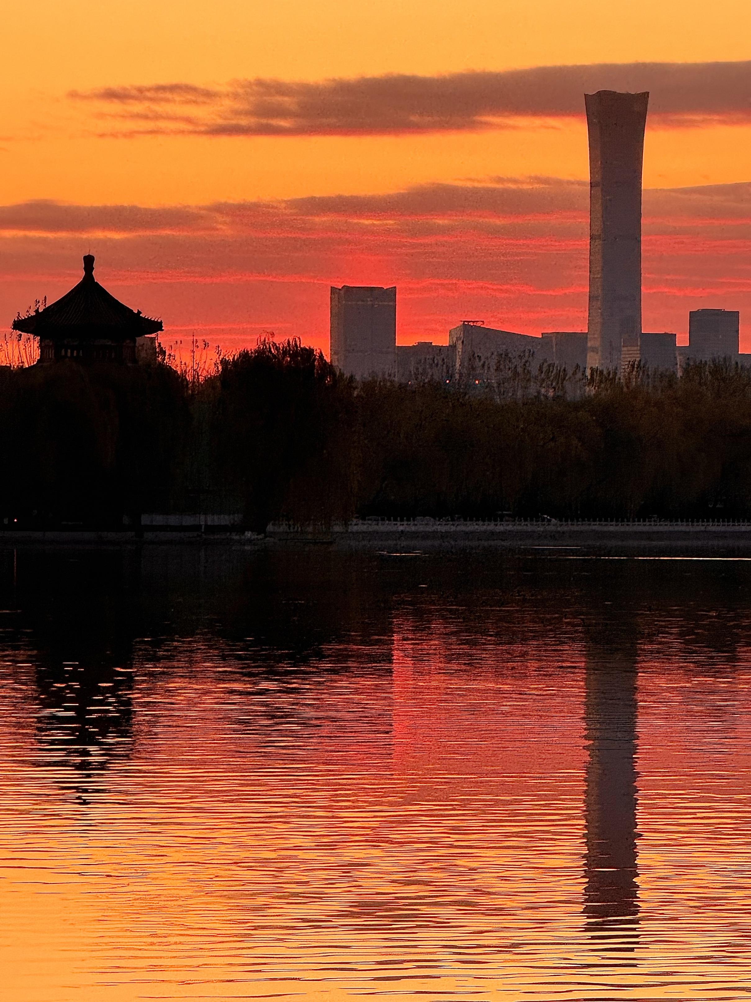 今天清晨的后海,天边燃起一片绚烂的火烧云,为粼粼水波的景致披上了一袭华美的霓裳。温红征 摄