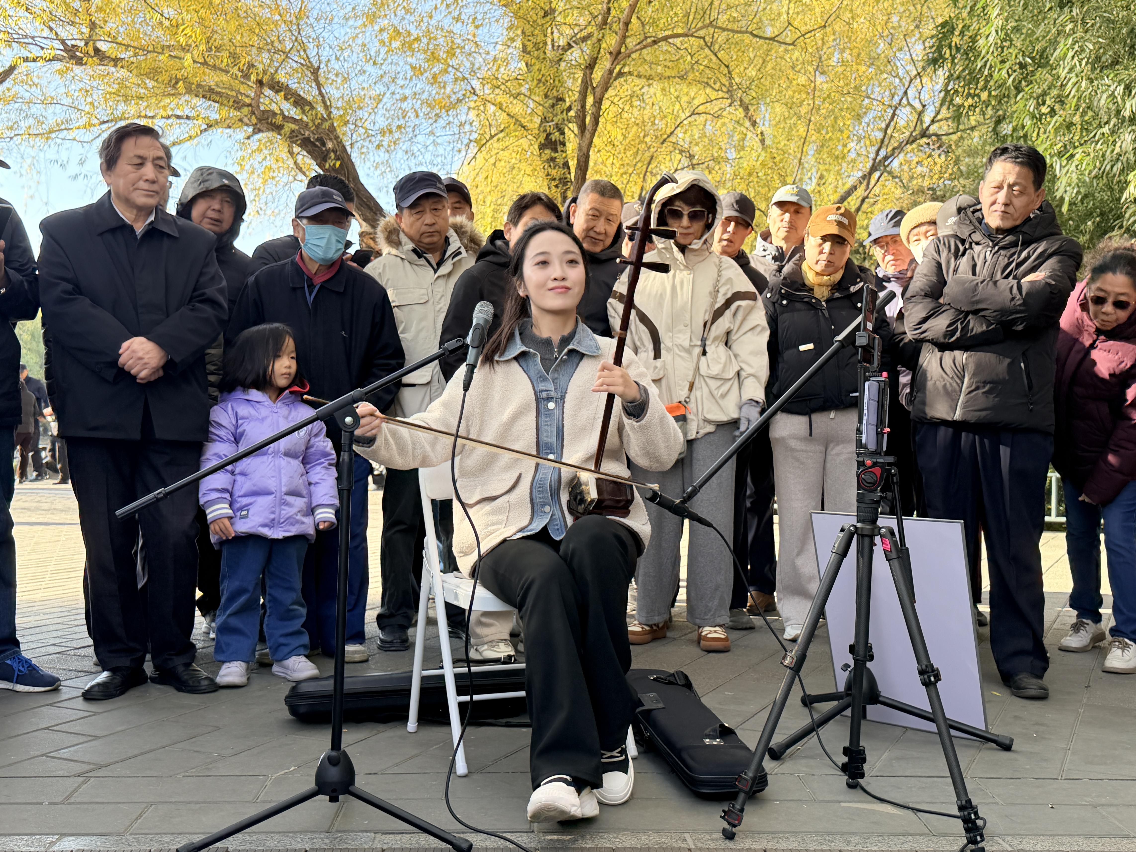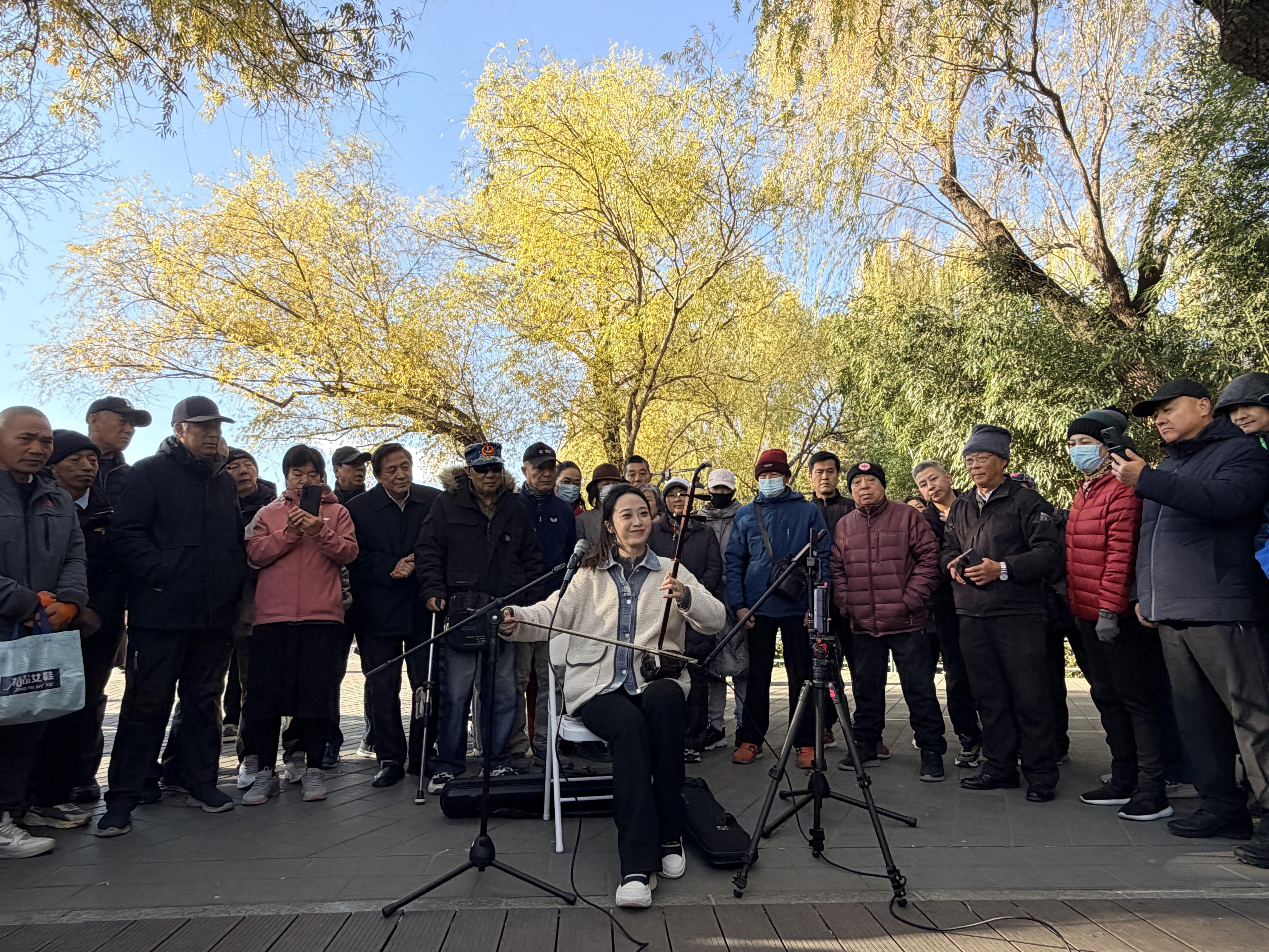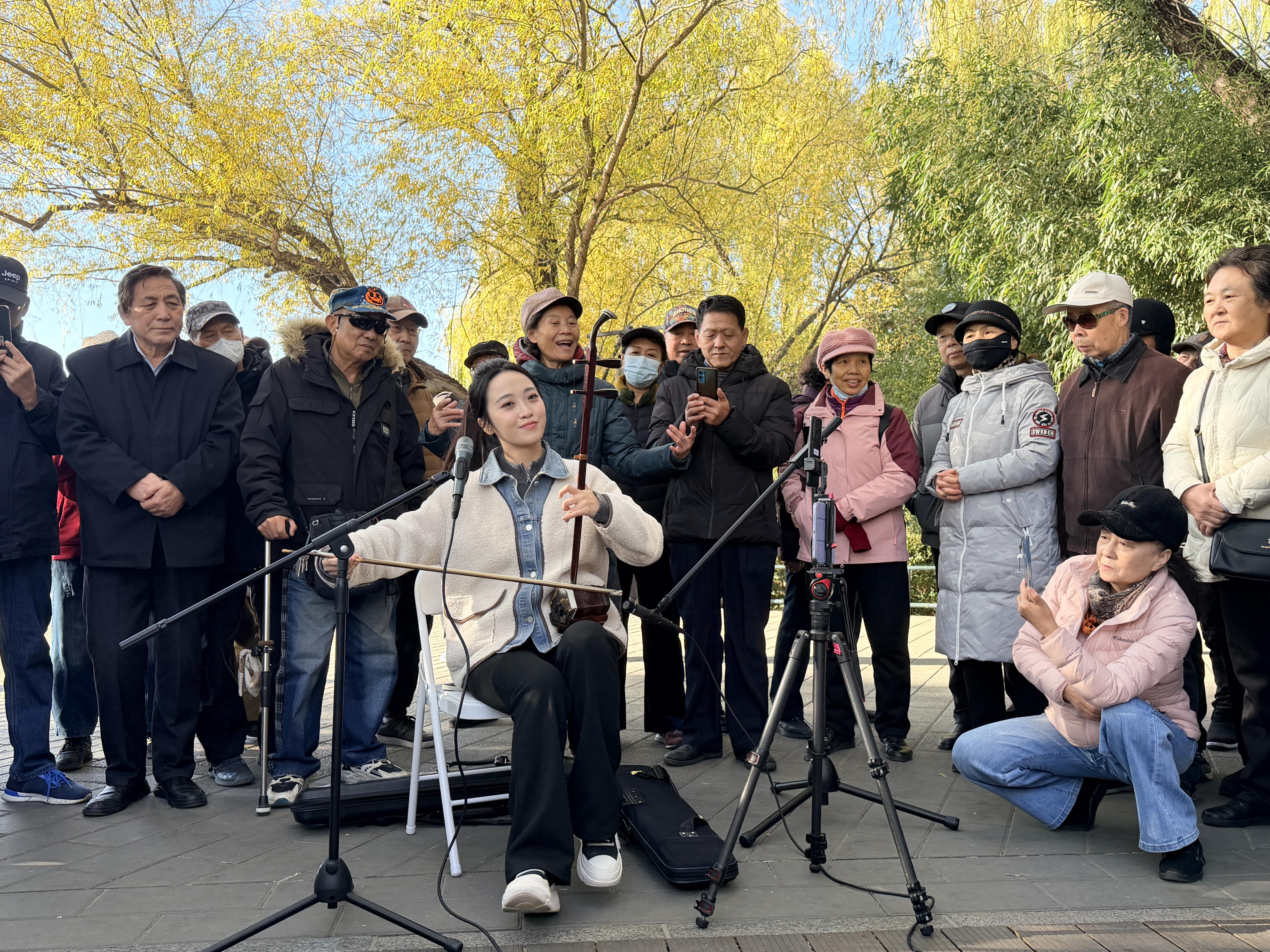 11月19日上午,紫竹院公园鸽子广场传来悠扬的二胡声。毕业于中央音乐学院二胡演奏专业的研究生王天爱端坐人群中,指尖在琴弦上流转,《赛马》的激昂、《江河水》的悲怆、《我和我的祖国》的深情接连上演,引得观众自发围拢成圈,不少大爷大妈高声合唱,现场叫好声此起彼伏。