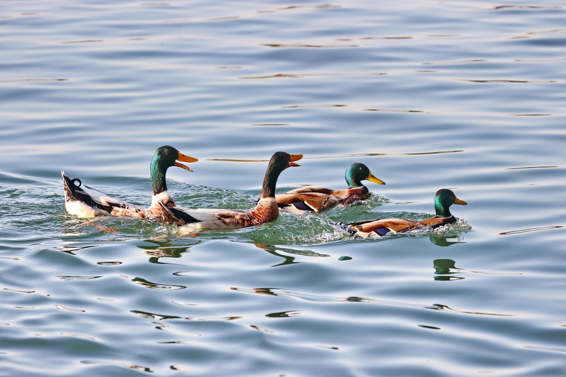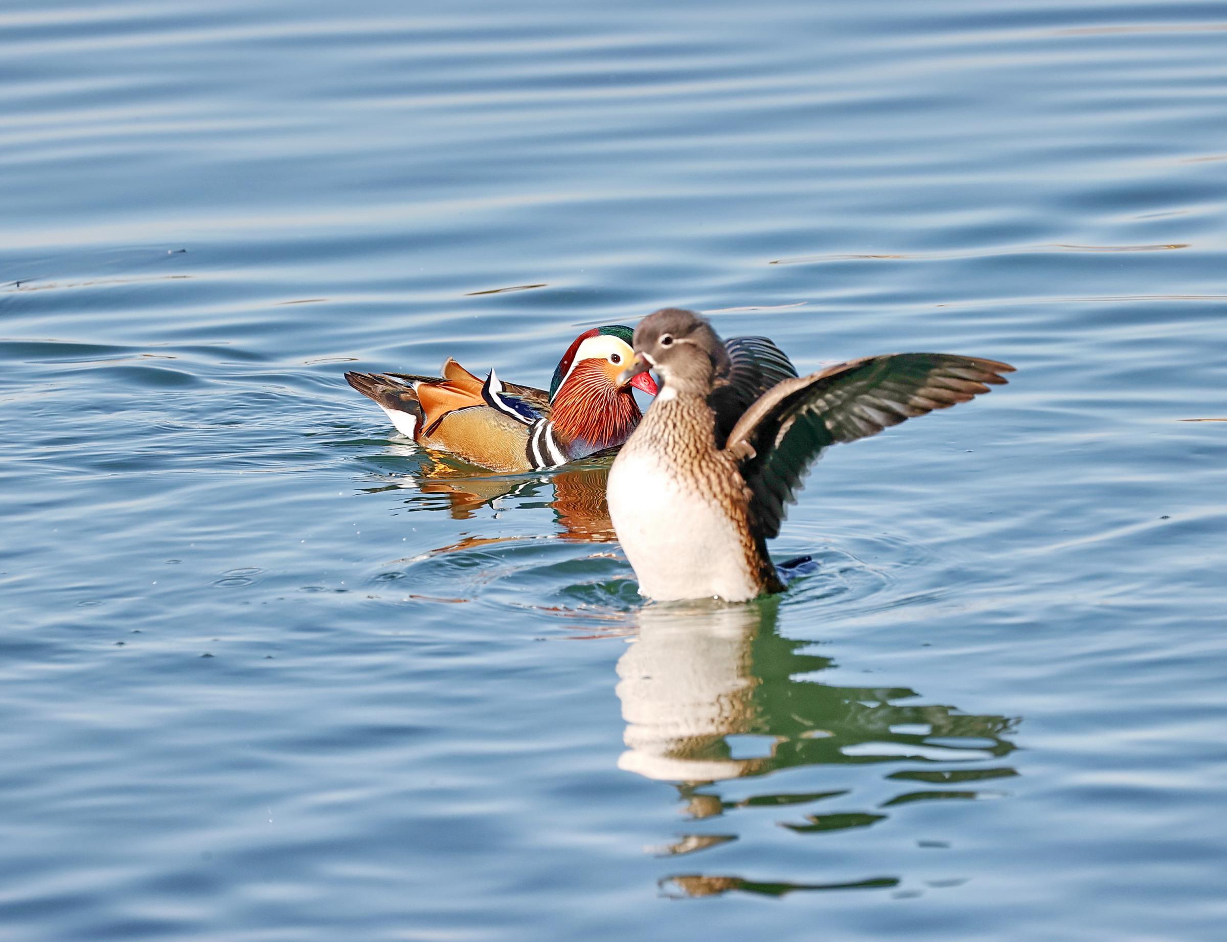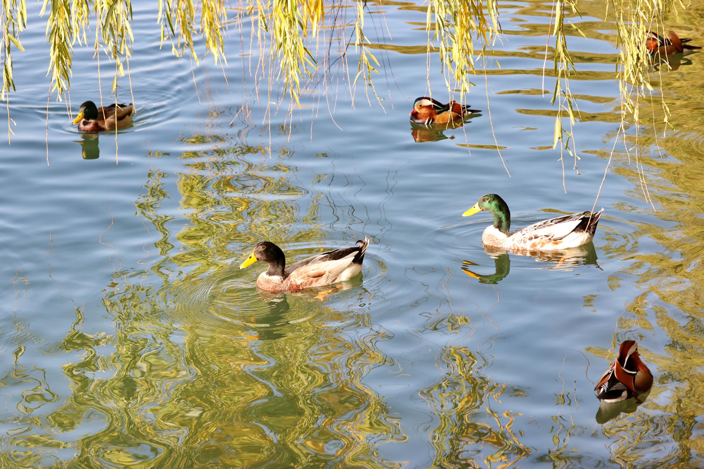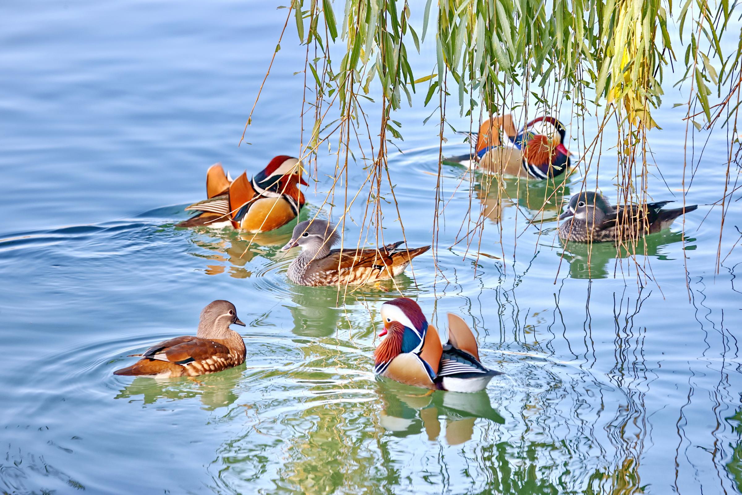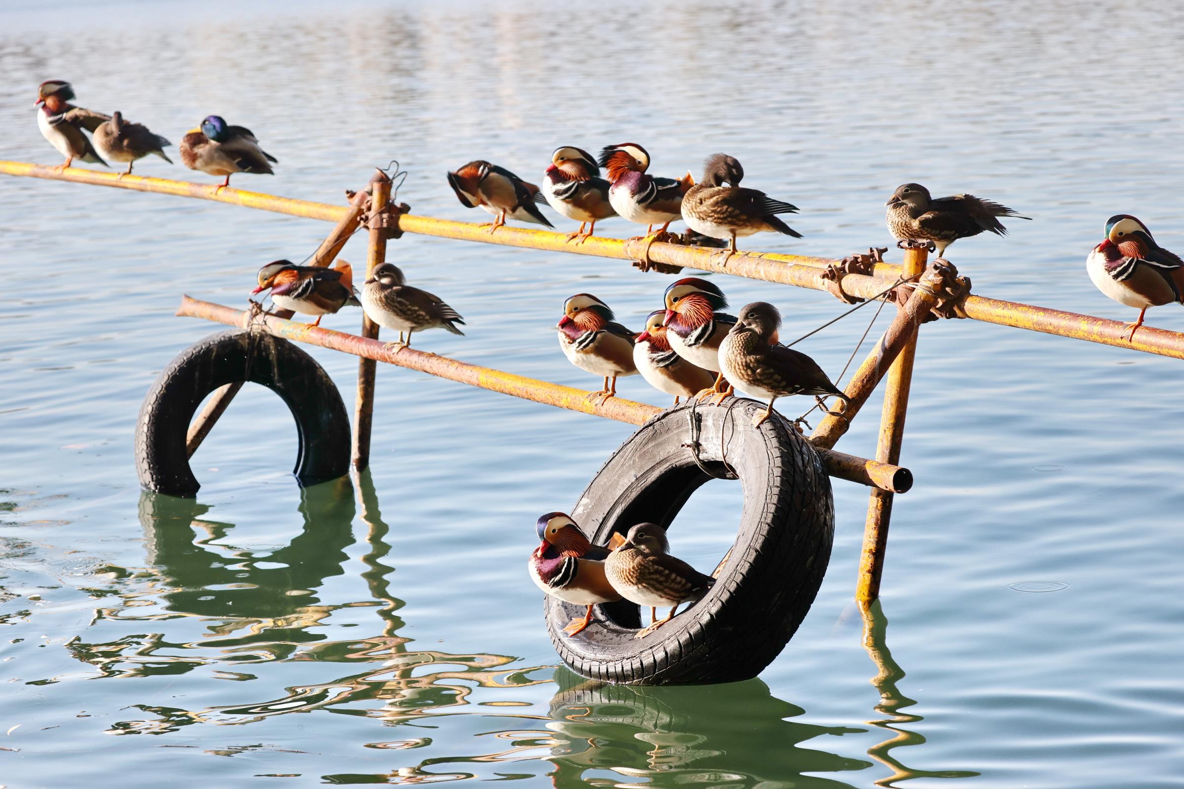 初冬时节,一群鸳鸯、野鸭在北海公园太液池上戏水玩耍、晒太阳,萌态十足。王新 摄