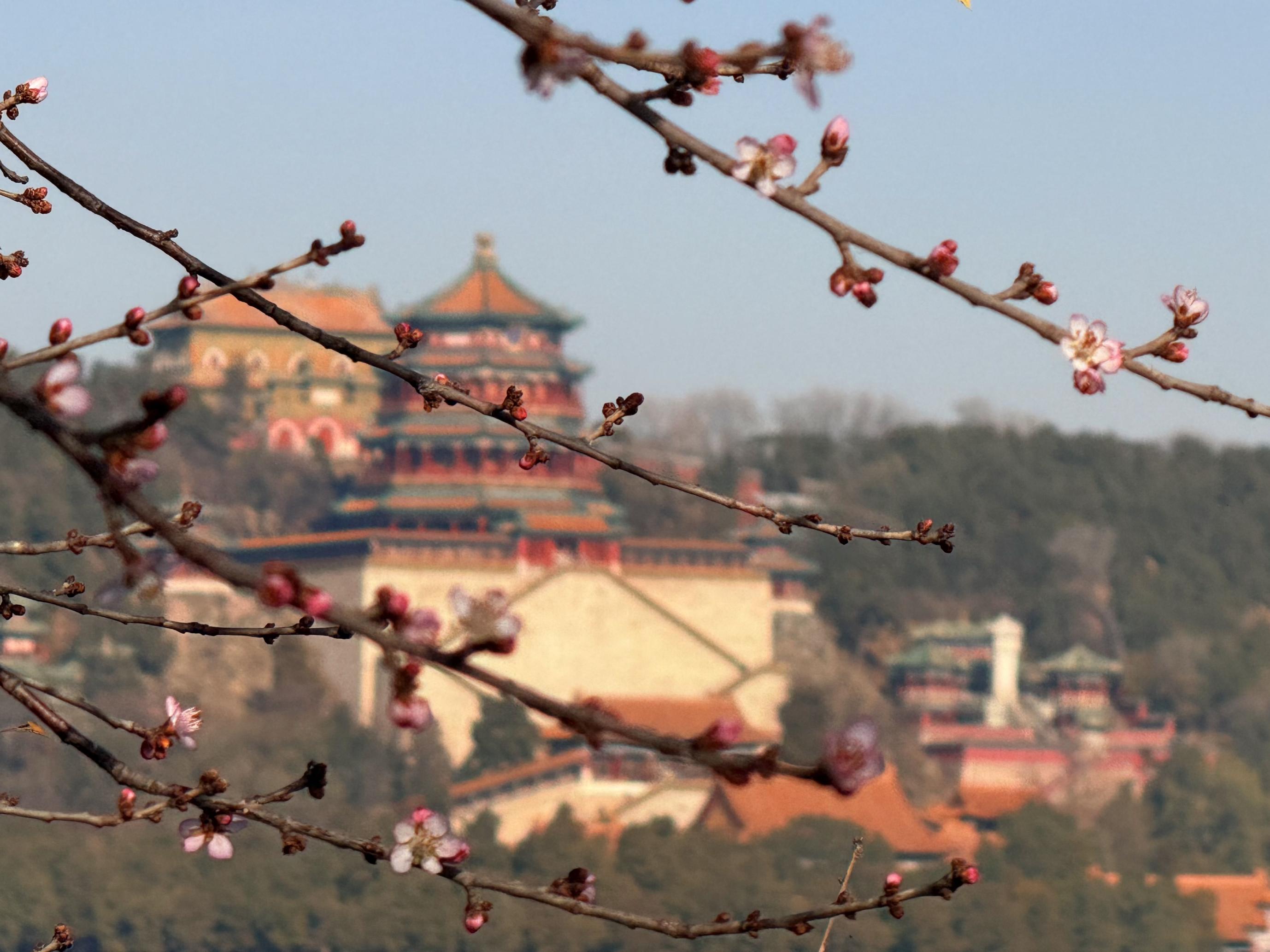 近日,颐和园西堤的一株大山桃树开出粉色花朵,色彩明艳,成为网红打卡点。温红征 摄