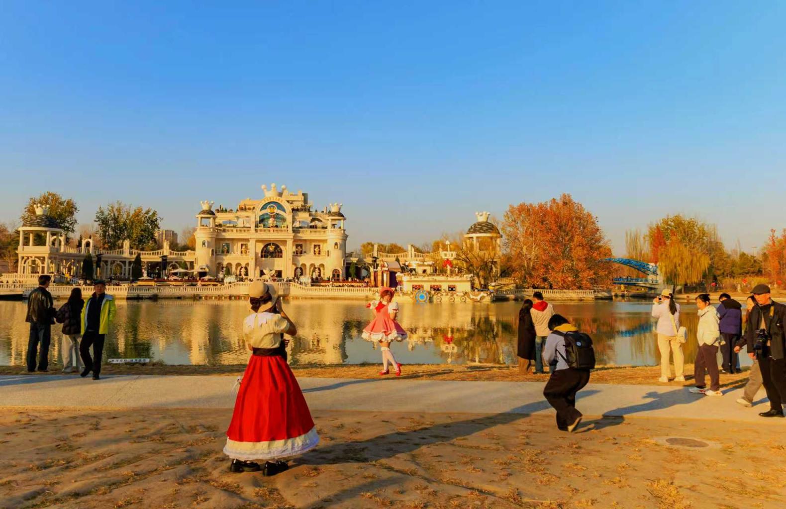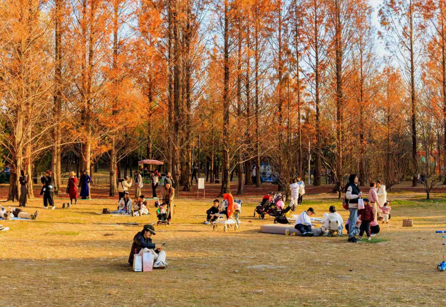 冬虽至,秋未尽。公园里松柏依然翠绿,水杉虽树叶落满地,仍红红火火。朝阳公园阳光明媚,市民们携家带友游园,老人静坐草地晒太阳、孩子追逐嬉闹、姑娘们摆姿拍照…… 张志仁 摄