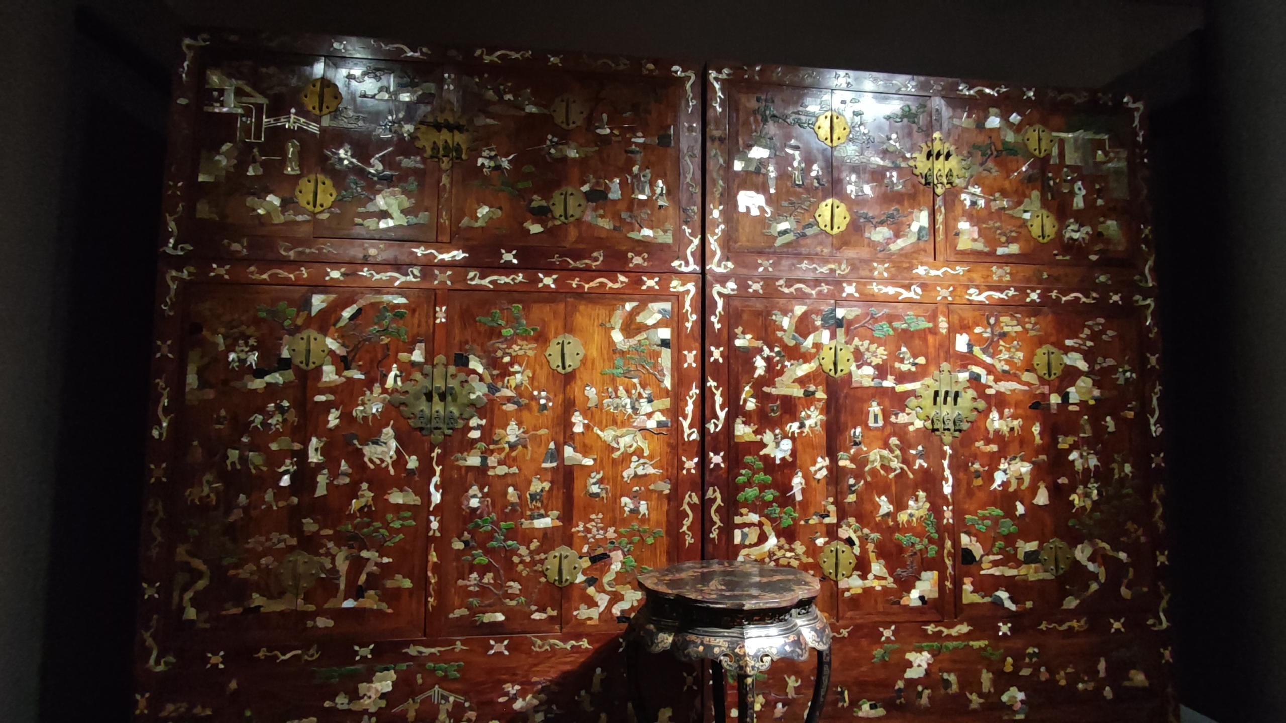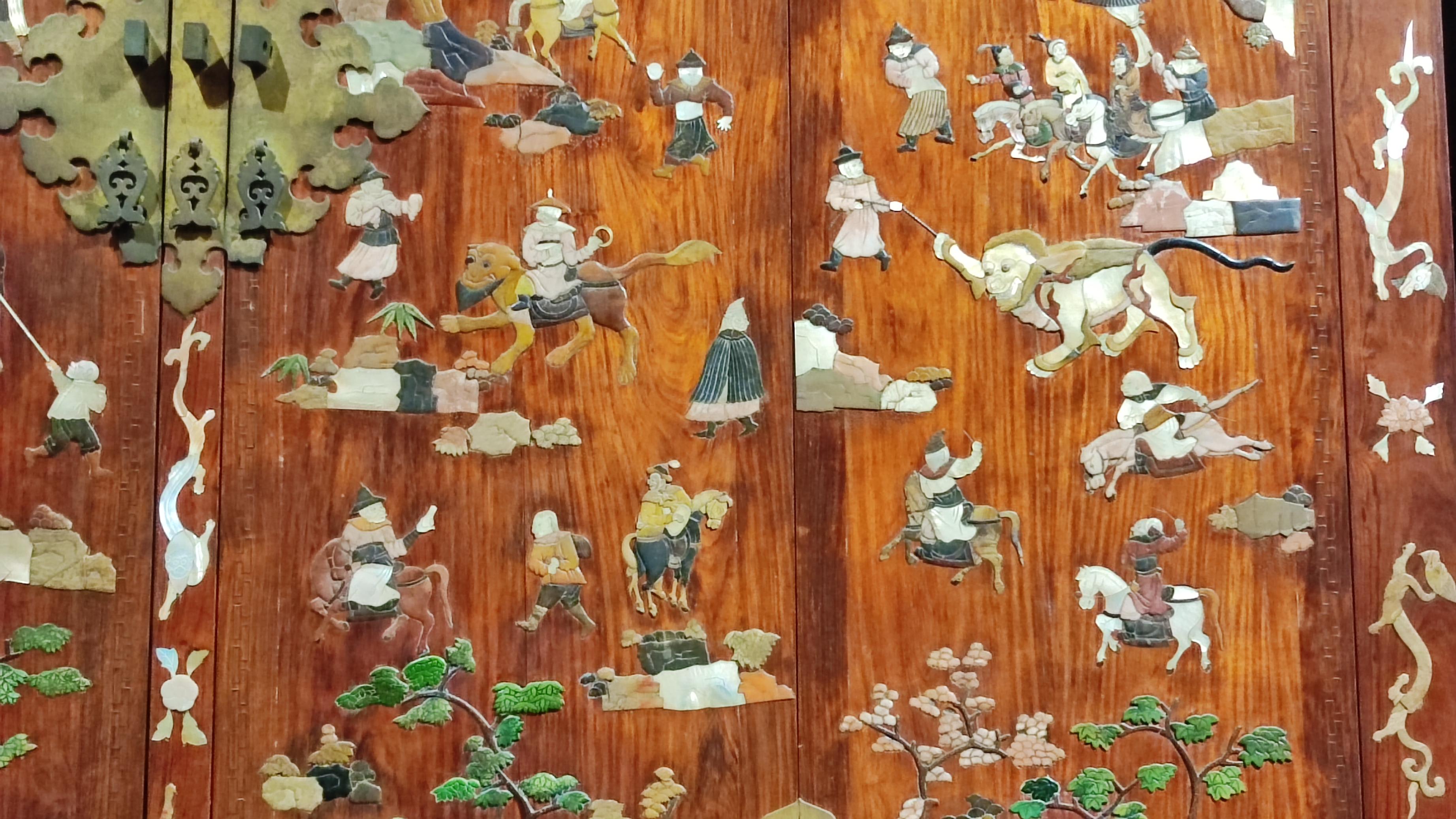 雍正五年(1727年),16岁的四阿哥弘历与小半岁的富察氏奉旨成婚。这对新婚小夫妇的住所被安排在紫禁城乾西二所,也就是今天的重华宫。柜子上的图案分为上、中、下三层:最底下一层是婴戏图,满是用螺钿和叶蜡石镶嵌而成的各种小孩子玩耍的场景,柜子中层和上层为蕃人进宝图以及历史故事图。