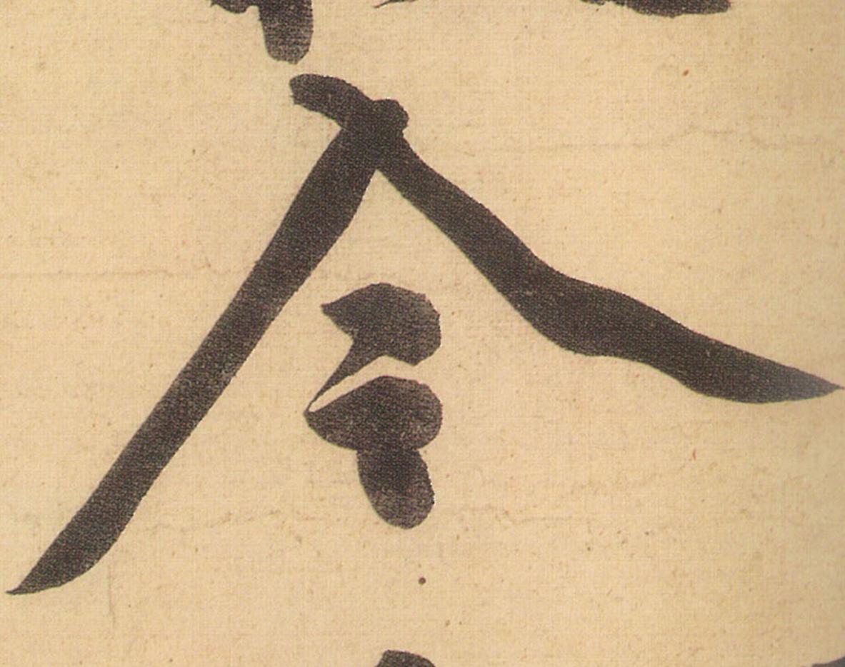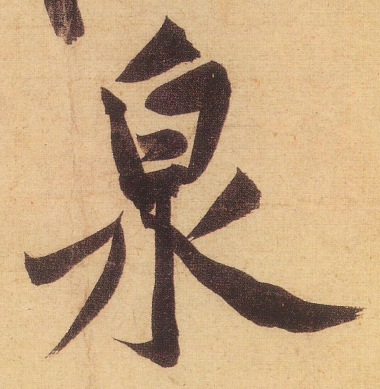 从结体上看,此卷中宫收紧,字向中心聚拢,而外部舒展,字朝八面开张。如“泉”字,笔画都向中间聚集,而撇捺则向左右两侧开张,整个字就显得舒展而有力量,其他如“来”“斧”“今”“夜”等字都有同样的效果;“年”字则中心聚拢而外,撇、横、竖三个拉长的笔画使字形向三个不同的方向延展,改变了原本的竖长形态,增了横向的张力,其他如“饥”“沈”“惊”等字亦如是。此卷结体的另一个显著特征是字形向右上倾斜,以侧险取势。结合其点画特征来看,在这种斜势中,此帖常将拉长的笔画写得丰富而有意趣,如字中本不显著的撇画多延长收笔动作,本来平正的横画常提早起笔,造就了独特的主笔形态,打破了原有字形的外部轮廓,创造了新的结构样式。如“筵”之长捺向左上昂头探出,“夜”之撇捺向左右屈膝而坐,“饘”之长撇往左下甩出胳膊,“我”之斜钩向右下伸出长腿,“三”之长横提前拖出水袖等,都打破了原本字主体的形态,让字形在一个方向上突出,具有很强的视觉冲击力。
