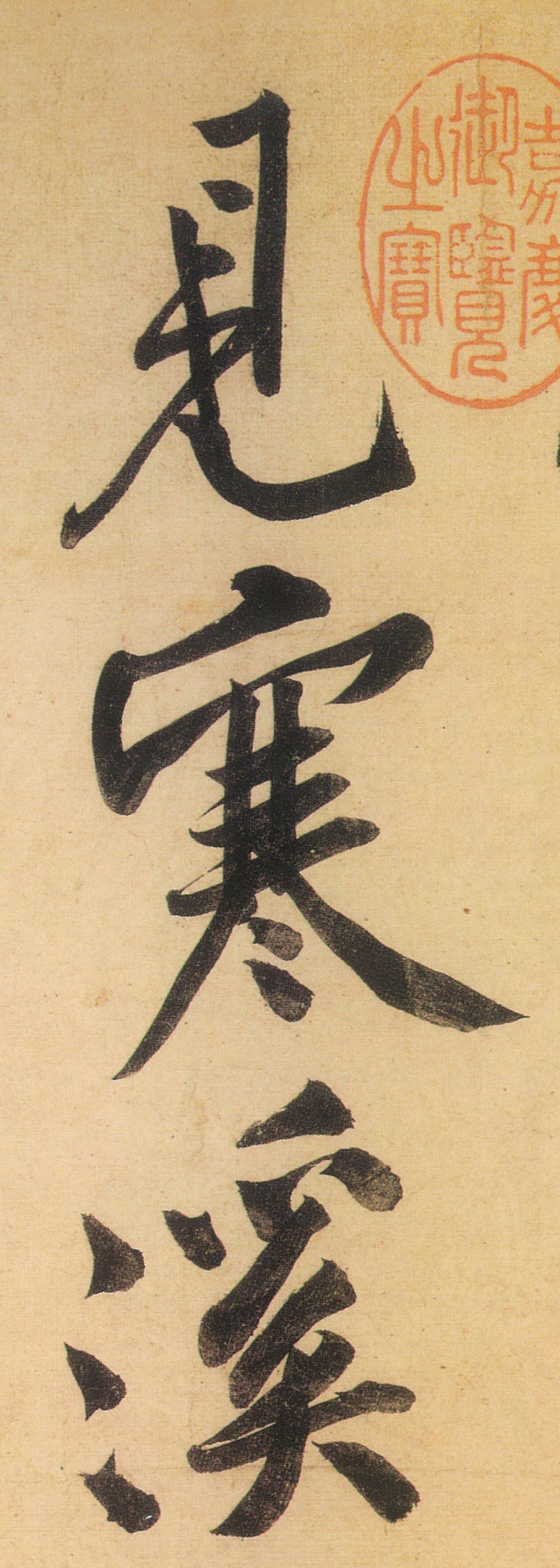 从章法上看,写此卷时,黄庭坚“长枪大戟”的风格早已成熟,横竖撇捺都写得极为开张,但是彼此之间并不产生龃龉,这得益于他独特的安排。通篇来看,每行字间连绵直下,上下字笔画穿插掩映,而行间则极为开阔,彼此独立。这种字间紧凑、行间开阔的处理,使得通篇的“长枪大戟”各安其位,和谐共处。