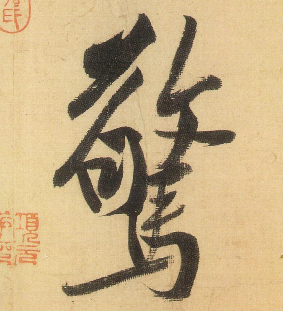 从上述分析中,可见黄庭坚书法最为显著的特征在于“长枪大戟”的笔画。我们知道,苏轼曾以“树梢挂蛇”来形容黄庭坚笔下长瘦的线条,而黄庭坚以“石压虾蟇”来形容苏轼笔下扁昂的形体。不论二人之说附会与否,其调笑之语,并非一时神思,而是颇有渊源。王羲之《笔势论十二章并序》说:“夫学书作字之体,须遵正法。……伤长则似死蛇挂树(腰枝无力),伤短则似踏死虾蟇(言其阔也),此乃大忌,可不慎欤!”故而,“长枪大戟”的线条忌在腰肢无力,须写得遒劲挺拔,才能显出字的精神。抛开玩笑,苏轼“树梢挂蛇”的说法也正点出了黄庭坚书法独特的魅力,其拉长的笔画确如龙蛇在笔下翻飞,将书法的线条写出了一重新的独特的美感。这种线条极富张力,打破了他之前的书家的书写样貌和风格追求,将自唐代而来的狂草书在线条上外放之力,截断蓄积,凝练为更为平和的笔底风云,为宋代书法的突围增添了浓墨重彩的一笔。