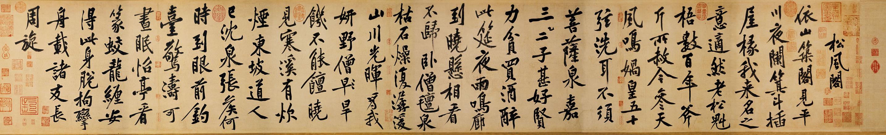 宋徽宗崇宁元年(1102)九月,黄庭坚与朋友游鄂城樊山,途经松林间亭阁,宴饮观风,听夜雨而成韵,又书之而为帖。其时黄庭坚已入晚年,诗书俱老,读此帖诗书,便可见黄庭坚诗、书寓奇崛于悠放的艺术境界。