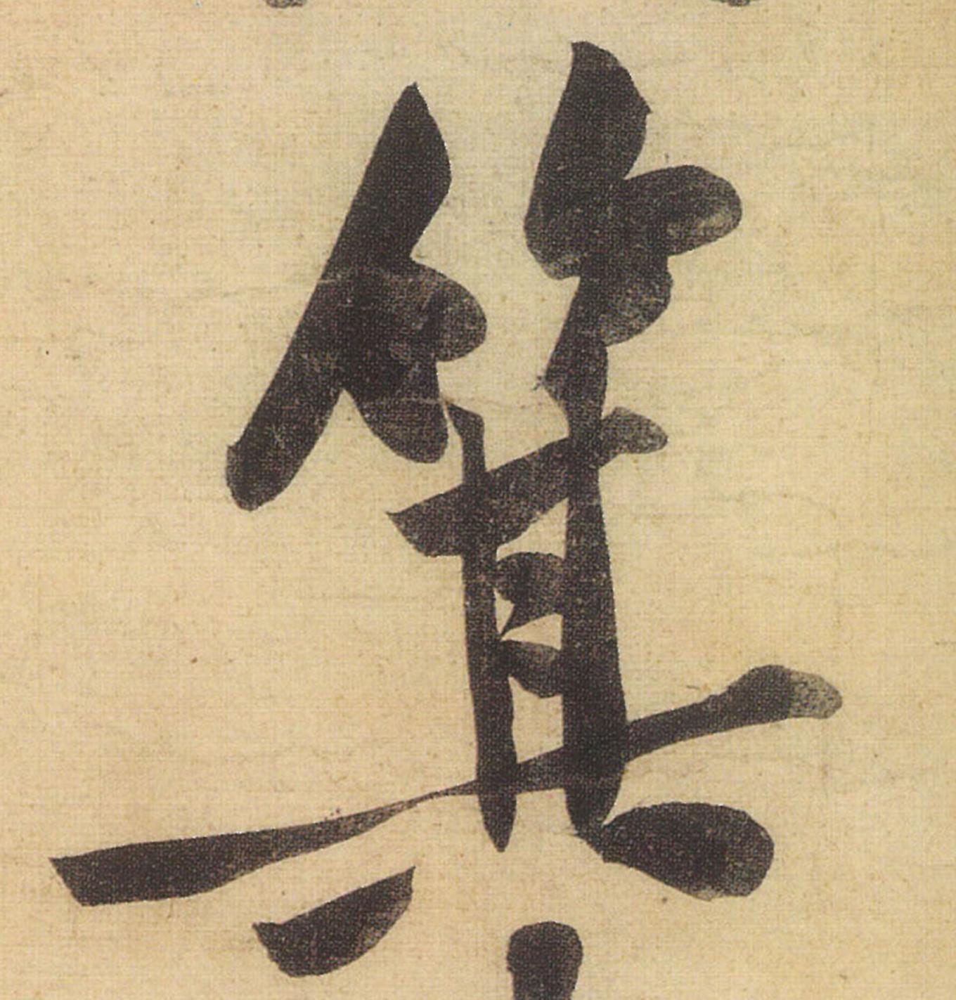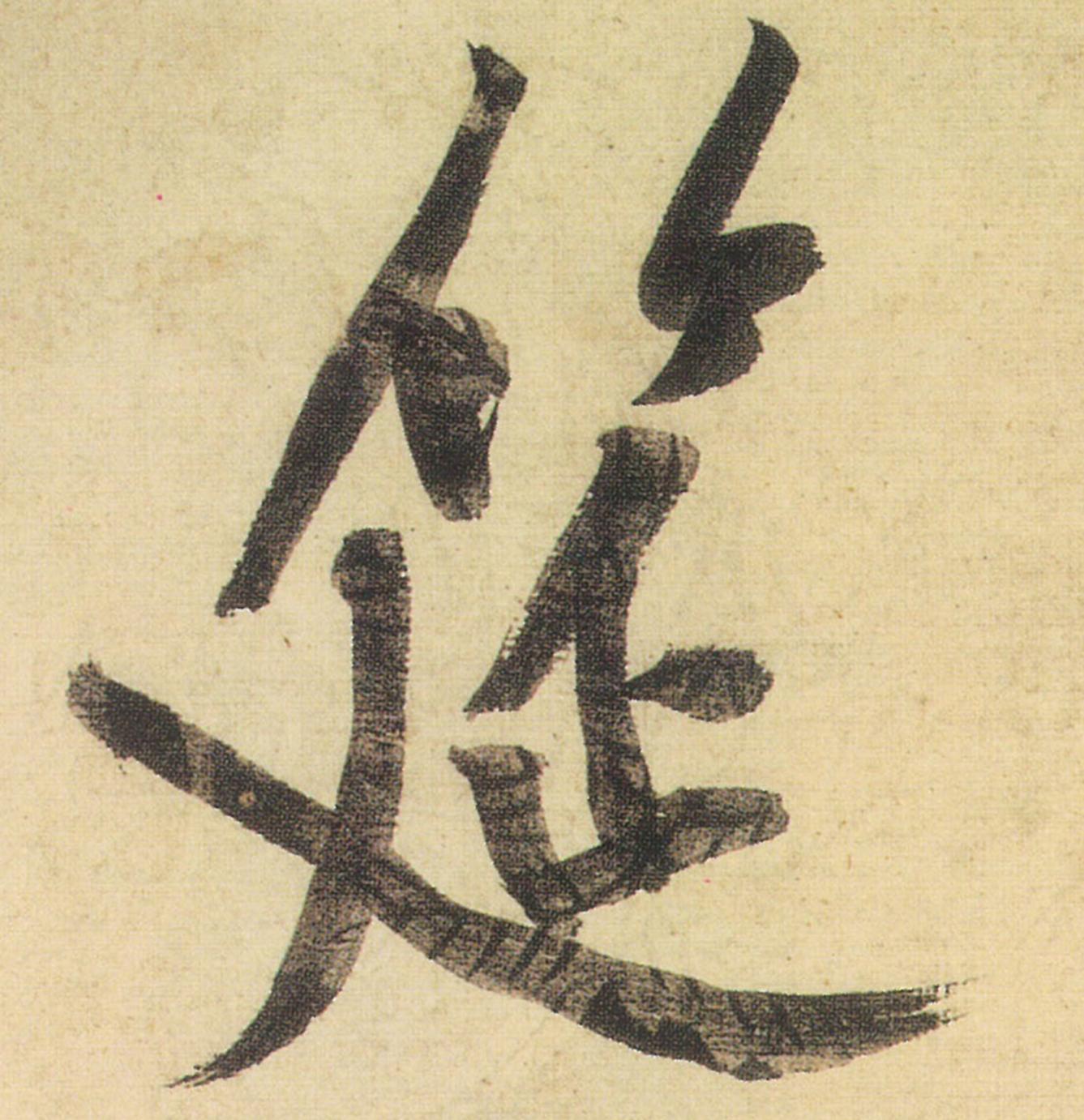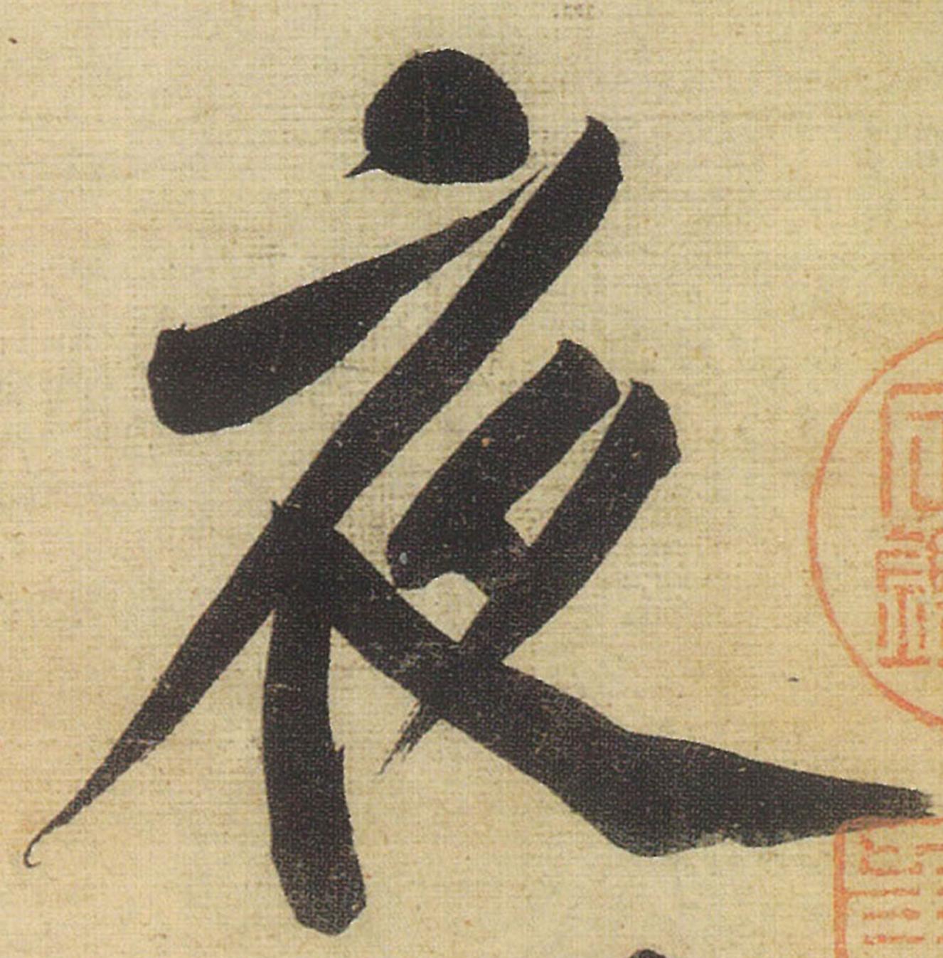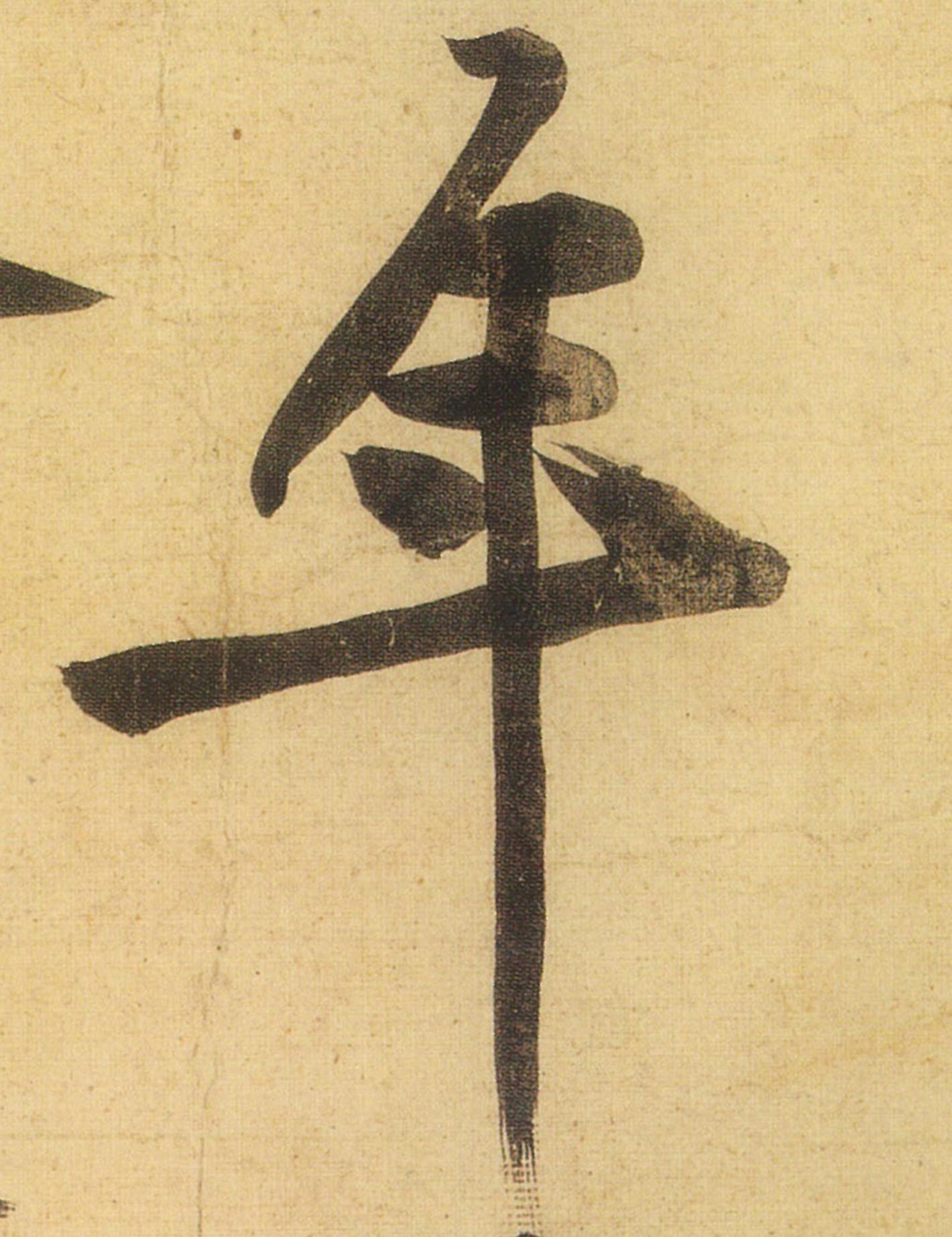 从结体上看,此卷中宫收紧,字向中心聚拢,而外部舒展,字朝八面开张。如“泉”字,笔画都向中间聚集,而撇捺则向左右两侧开张,整个字就显得舒展而有力量,其他如“来”“斧”“今”“夜”等字都有同样的效果;“年”字则中心聚拢而外,撇、横、竖三个拉长的笔画使字形向三个不同的方向延展,改变了原本的竖长形态,增了横向的张力,其他如“饥”“沈”“惊”等字亦如是。此卷结体的另一个显著特征是字形向右上倾斜,以侧险取势。结合其点画特征来看,在这种斜势中,此帖常将拉长的笔画写得丰富而有意趣,如字中本不显著的撇画多延长收笔动作,本来平正的横画常提早起笔,造就了独特的主笔形态,打破了原有字形的外部轮廓,创造了新的结构样式。如“筵”之长捺向左上昂头探出,“夜”之撇捺向左右屈膝而坐,“饘”之长撇往左下甩出胳膊,“我”之斜钩向右下伸出长腿,“三”之长横提前拖出水袖等,都打破了原本字主体的形态,让字形在一个方向上突出,具有很强的视觉冲击力。