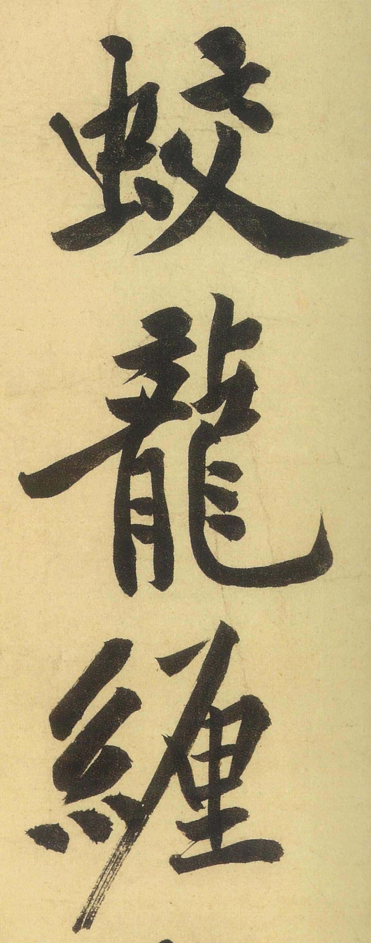 从上述分析中,可见黄庭坚书法最为显著的特征在于“长枪大戟”的笔画。我们知道,苏轼曾以“树梢挂蛇”来形容黄庭坚笔下长瘦的线条,而黄庭坚以“石压虾蟇”来形容苏轼笔下扁昂的形体。不论二人之说附会与否,其调笑之语,并非一时神思,而是颇有渊源。王羲之《笔势论十二章并序》说:“夫学书作字之体,须遵正法。……伤长则似死蛇挂树(腰枝无力),伤短则似踏死虾蟇(言其阔也),此乃大忌,可不慎欤!”故而,“长枪大戟”的线条忌在腰肢无力,须写得遒劲挺拔,才能显出字的精神。抛开玩笑,苏轼“树梢挂蛇”的说法也正点出了黄庭坚书法独特的魅力,其拉长的笔画确如龙蛇在笔下翻飞,将书法的线条写出了一重新的独特的美感。这种线条极富张力,打破了他之前的书家的书写样貌和风格追求,将自唐代而来的狂草书在线条上外放之力,截断蓄积,凝练为更为平和的笔底风云,为宋代书法的突围增添了浓墨重彩的一笔。