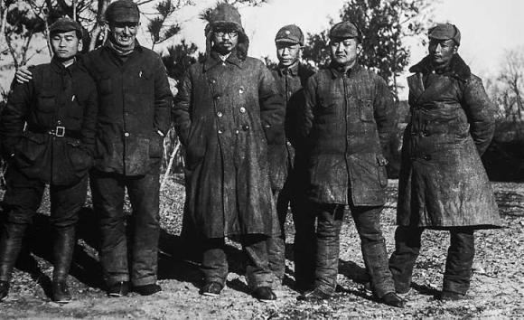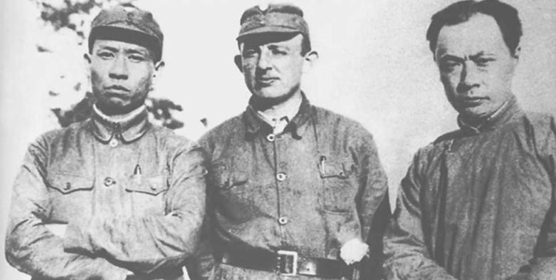 刘少奇(左一)、陈毅(右一)和在新四军工作的奥地利医生罗生特在盐城的合影。