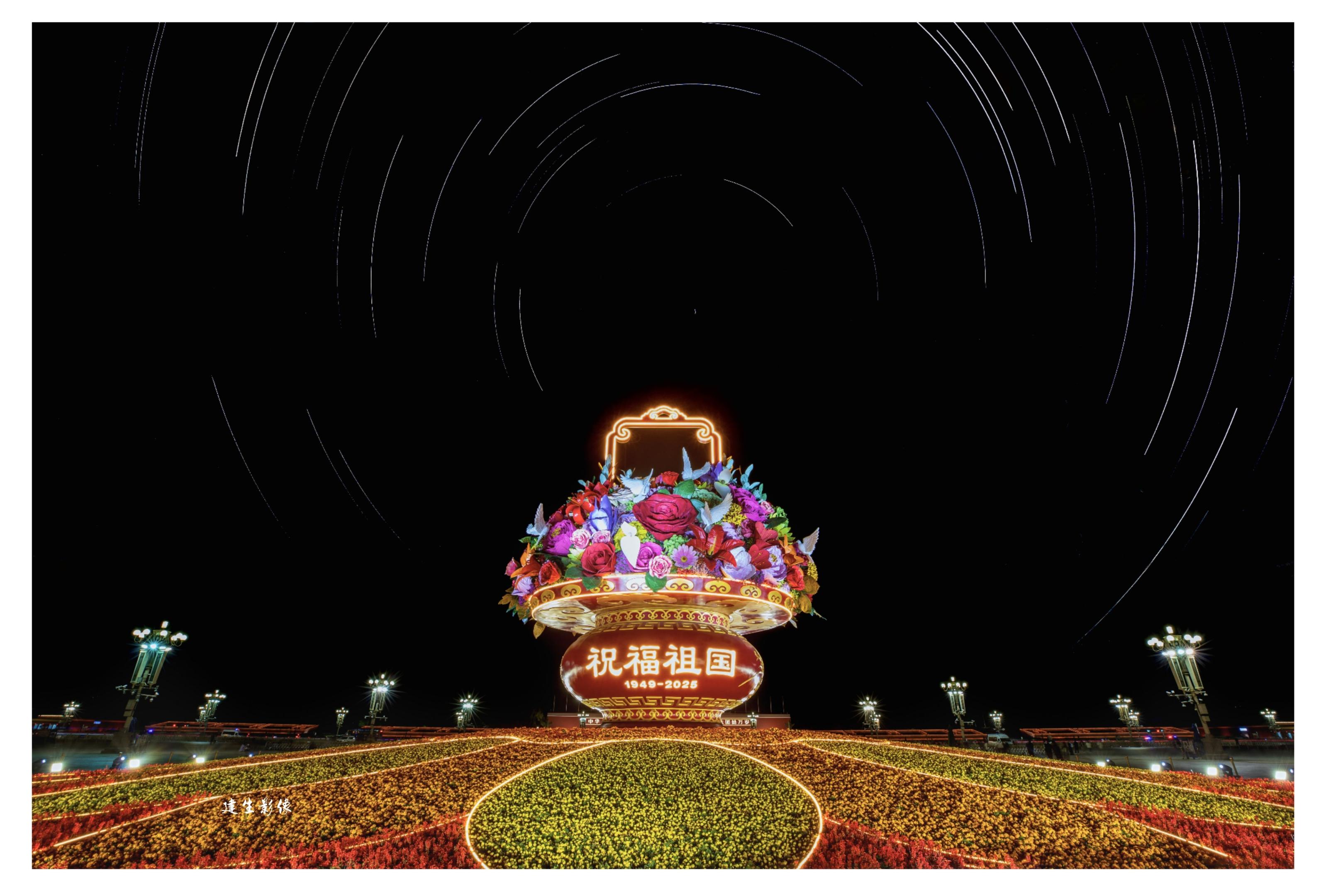 天安门广场“祝福祖国”大花篮在星轨映衬下愈显璀璨。温建生 摄