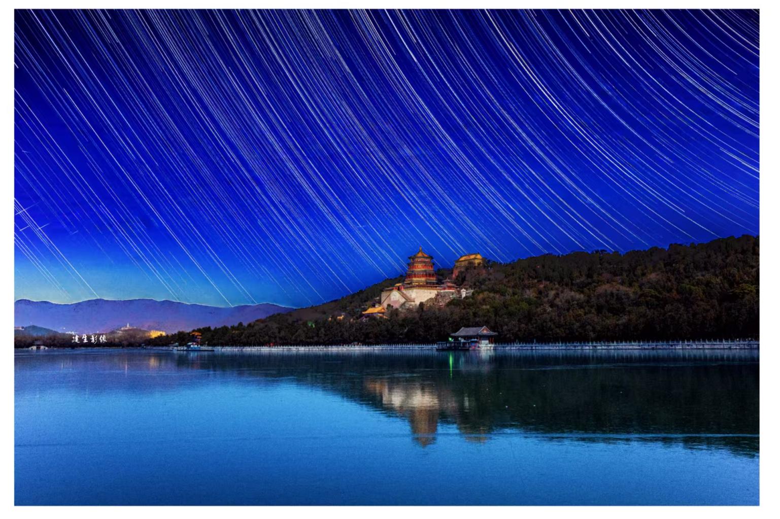 颐和园星轨与湛蓝湖面相映。 温建生 摄