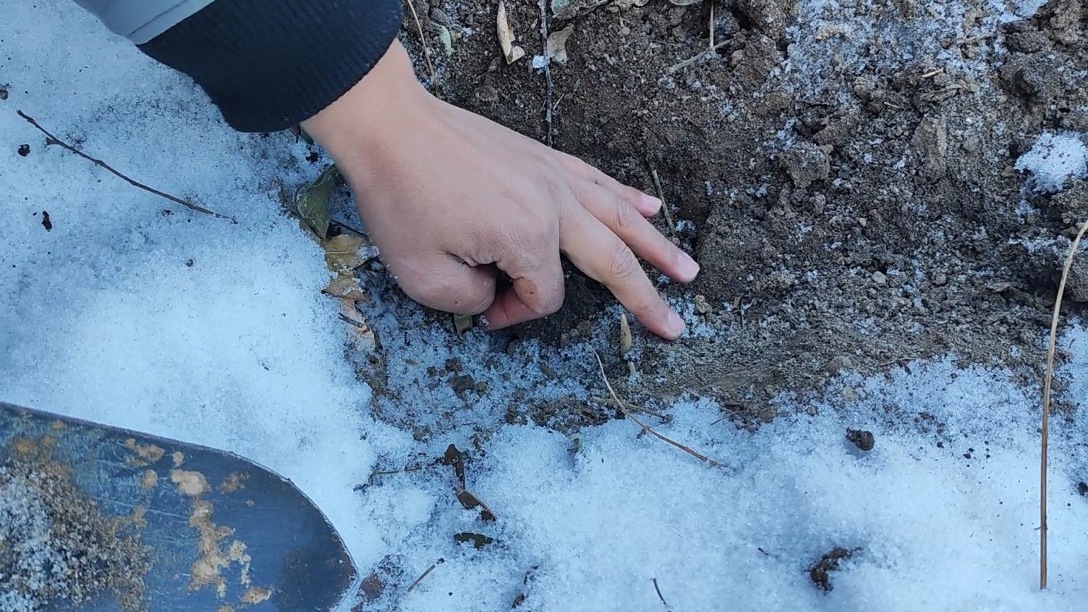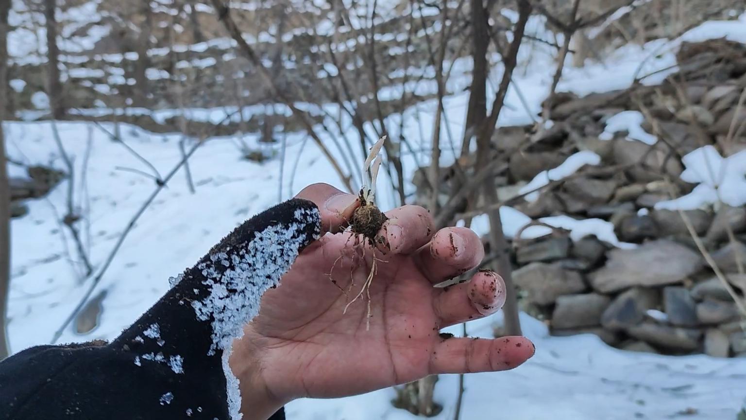 为了研究其生存策略,一个冬日,笔者来到了门头沟中门寺的一块林地。春天时,我在这里看到了一片小药八旦子的花海,星星点点的蓝色,将这里点缀得极为漂亮。冬天时,这里人迹罕至。我去的时候,北京刚好下了一场雪。扫去地上厚厚的积雪,小心翼翼地铲去土层,没一会儿在土堆里看到了小药八旦子的嫩芽。顺着嫩芽往下挖,便是它的块茎。此时,它圆圆鼓鼓的,蓄满了能量。嫩芽在块茎的滋养下,显得生机勃勃。