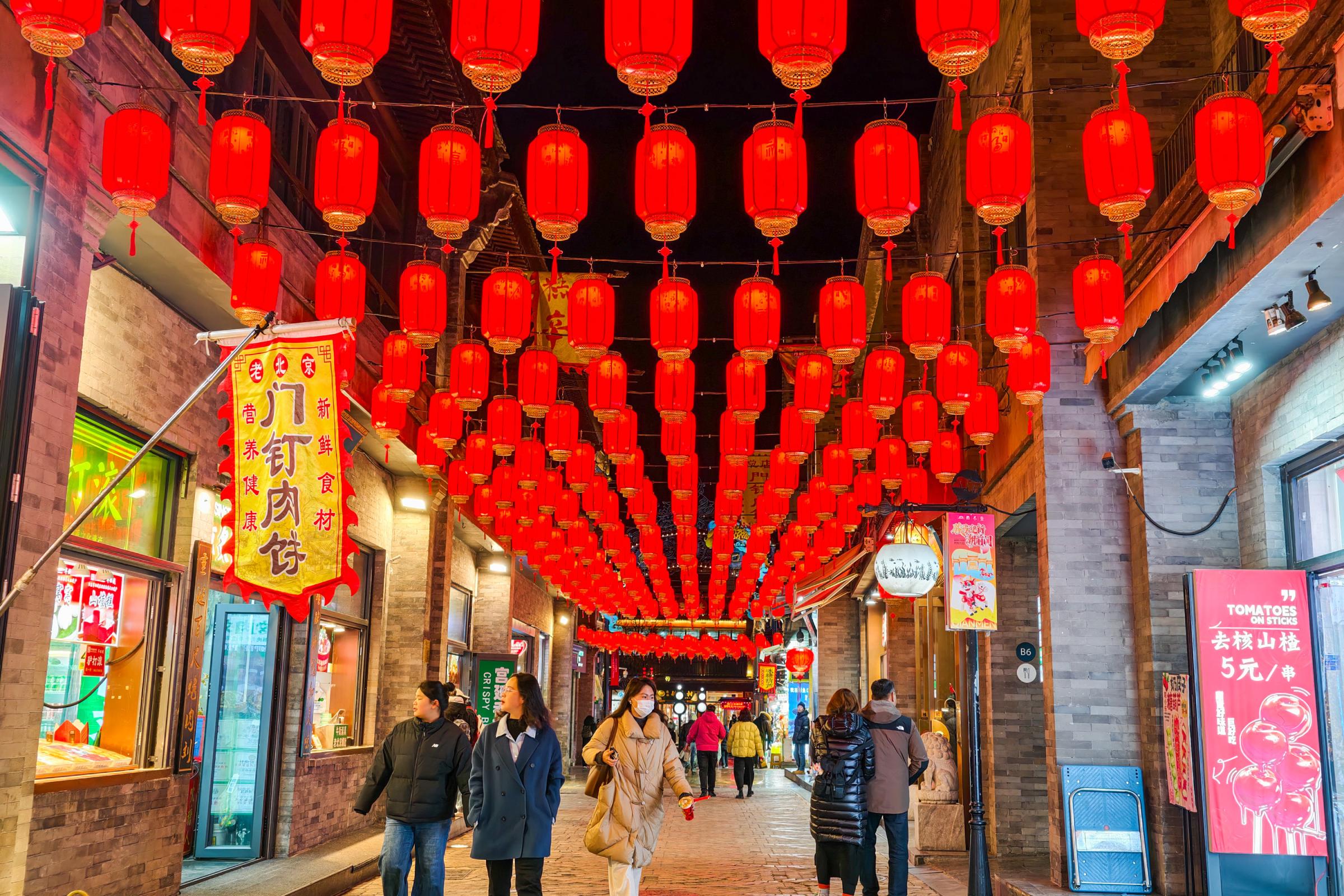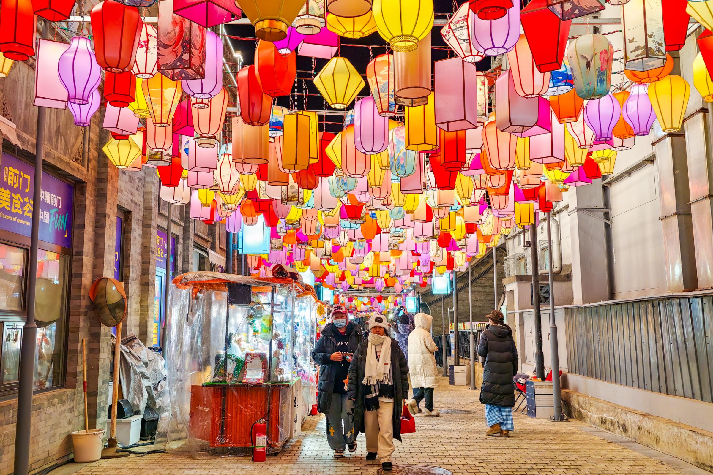 新年到来,北京各大商街节日氛围浓厚,前门大街及周边胡同挂出各式彩灯,增添喜庆祥和。