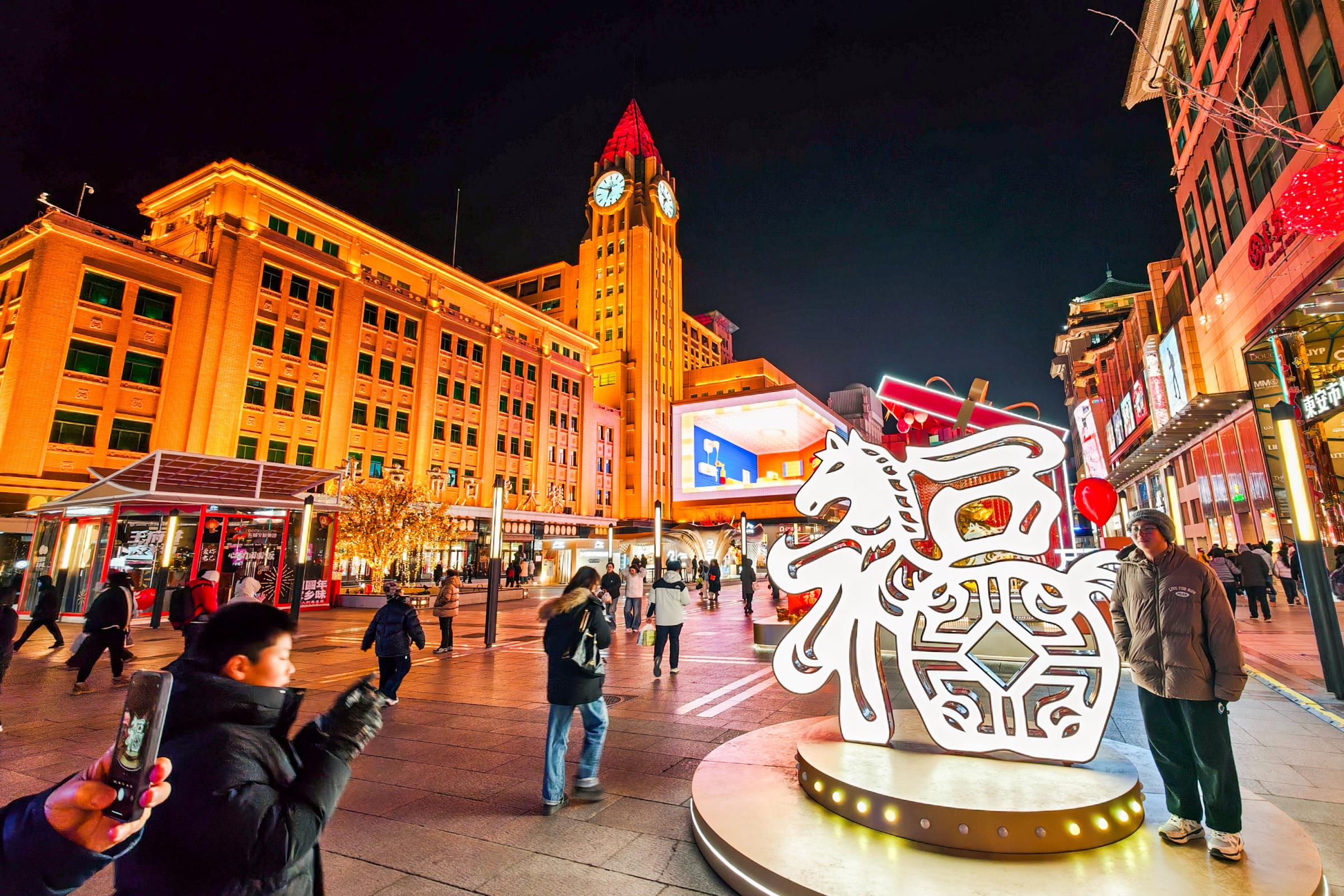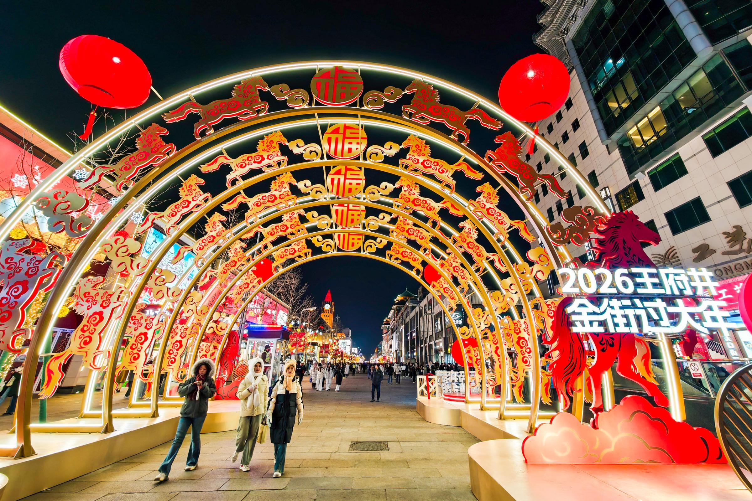 新年到来,北京各大商街节日氛围浓厚,王府井大街设置金街过大年主题装饰,营造繁华热闹新气象。