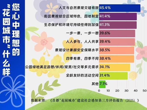 在被调查者对花园城市建设的期待排序中,“优化城乡公园布局,让身边有更多可达舒适宜人的公园”(46.7%)居首位,取代了2024年的“增加林荫空间”。在理想花园城市的描述中,“人文与自然景观交错有致”从2024年的第八位(24.7%)跃升至2025年的首位(45.4%)。这体现了市民不仅需要绿色,更需要有层次、有色彩、有故事、能共鸣的“有文化灵魂的花园式空间”。