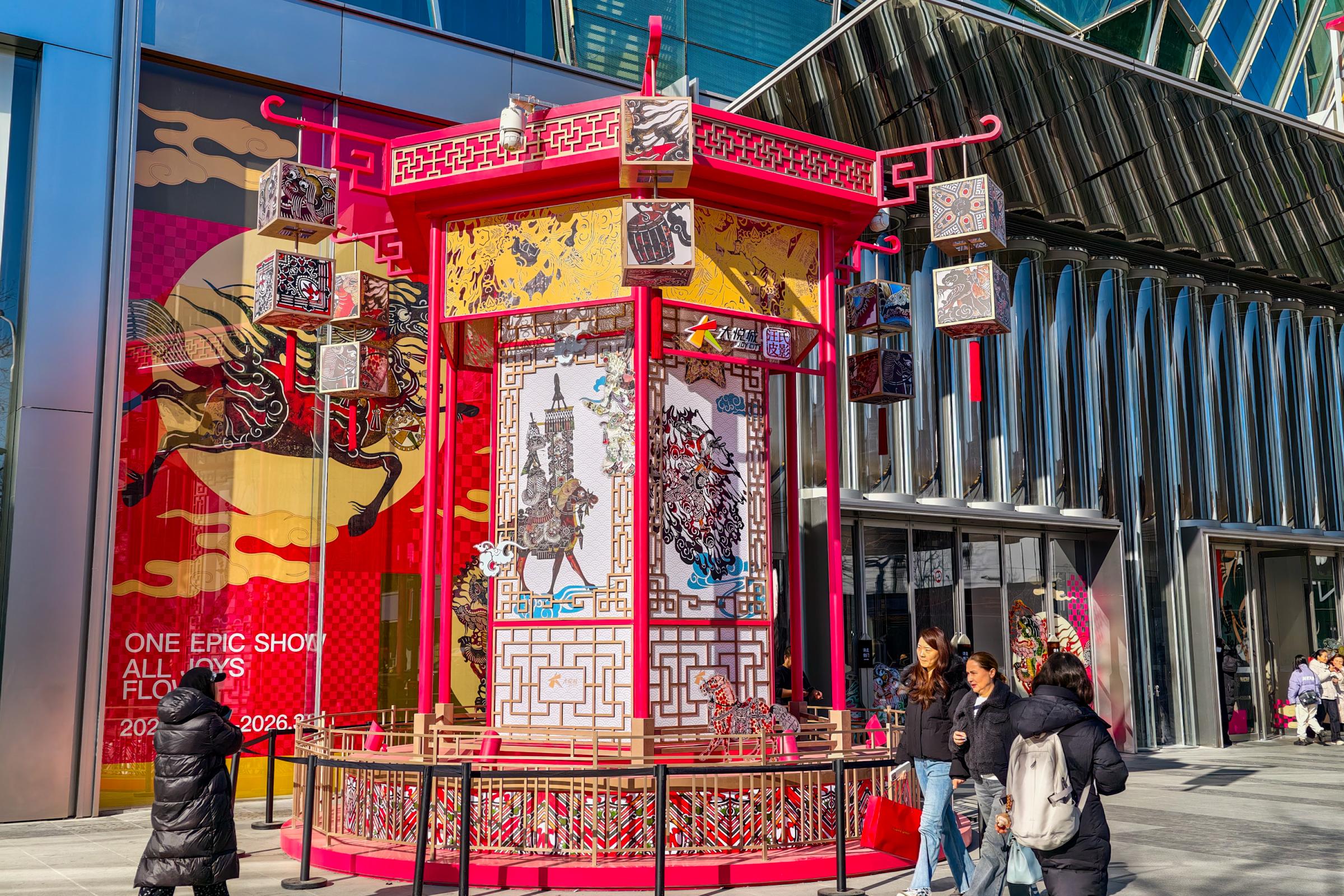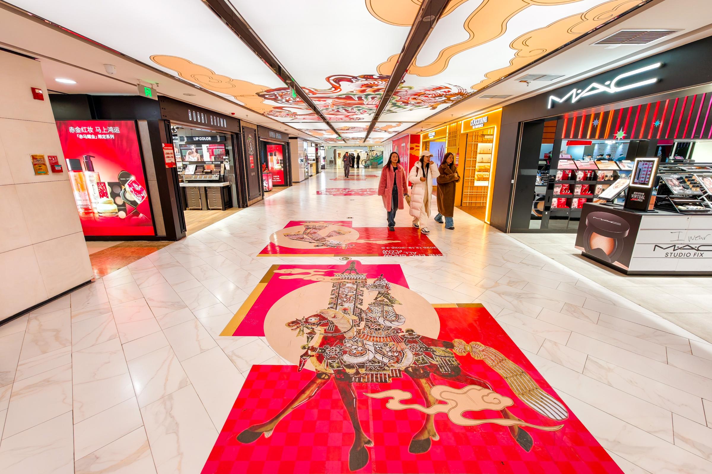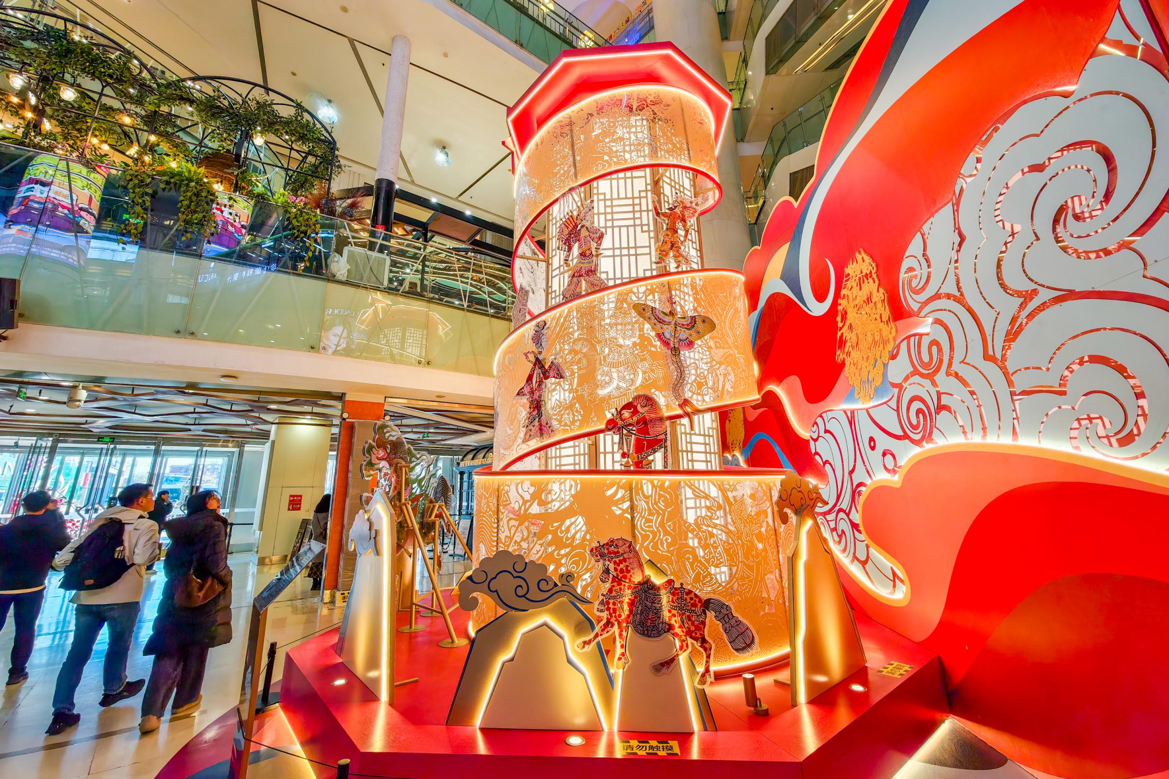 春节将至,北京各大商场换上新春布景,在西单大悦城,融入马元素的非遗皮影造型装饰营造红火热烈氛围,增添节日喜气。