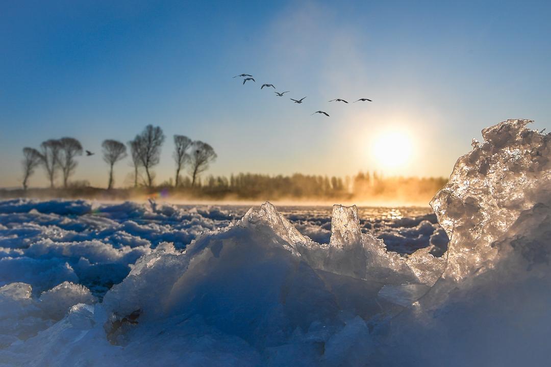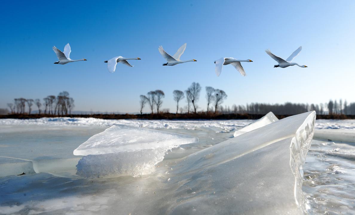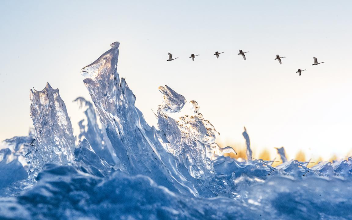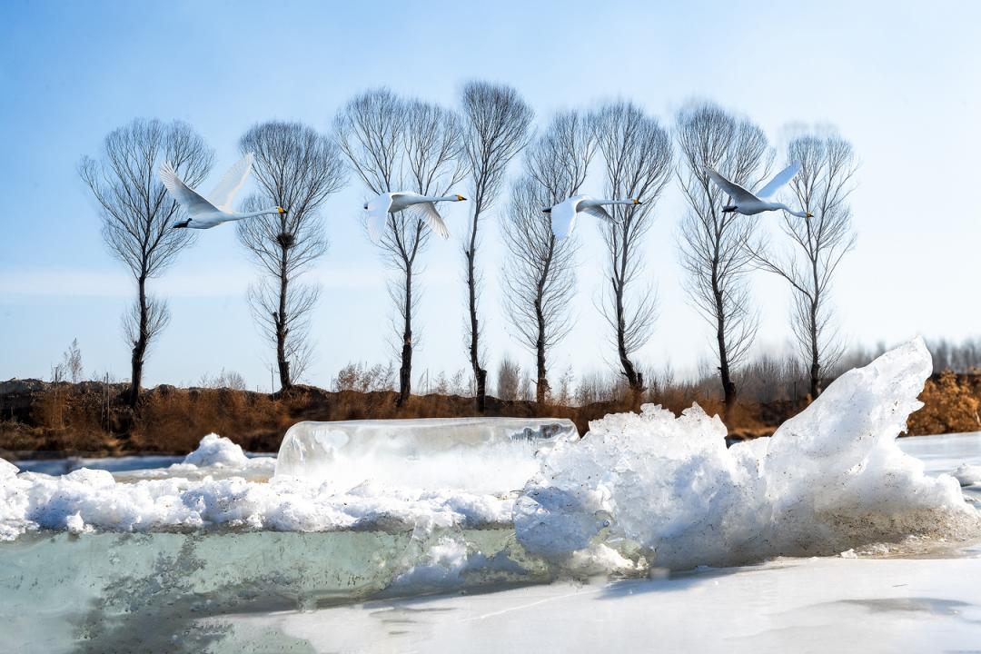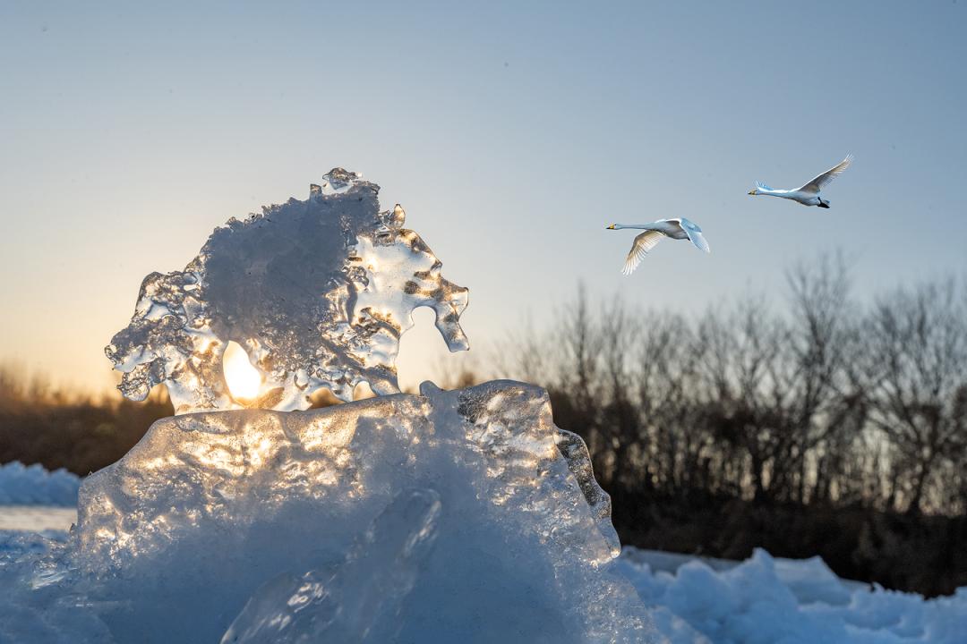 近日,辽宁朝阳北票连续降温,大凌河杨柳湾段,出现了晶莹层叠的冰凌景观。成群的大天鹅在碎玉般的冰凌间悠然游弋,或引颈长鸣,或展翅拍水,或比冀齐飞,为这片素裹的天地注入鲜活生机。冰与水、静与动交织,勾勒出寒冬里又一幅令人驻足的生动画卷,展现着生命对北国山川最执着的依恋。
