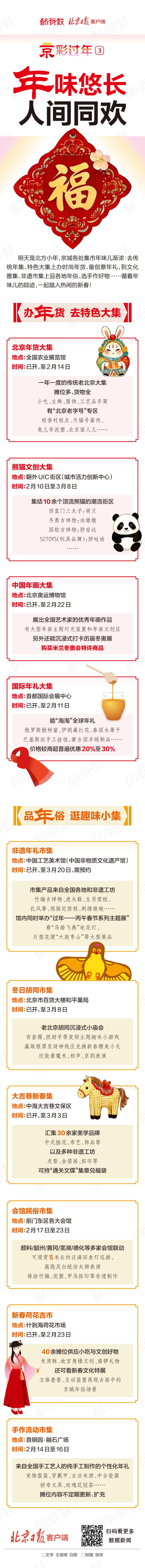 明天是北方小年,京城各处集市年味儿渐浓:去传统年集、特色大集上办时尚年货、备创意年礼,到文化雅集、非遗市集上品各地年俗、选手作好物……循着年味儿的踪迹,一起踏入热闹的新春!
