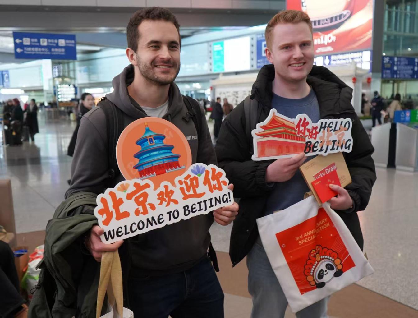 “真没想到!刚在伦敦希思罗机场挥手告别,转眼就在北京首都机场收获了这样一份惊喜!”2月16日下午,搭乘国航CA938航班抵京的英国小伙凯兰·米汉兴奋地说。他和妻子、朋友刚走出首都机场,就收到了北京市文化和旅游局精心准备的“新春大礼包”。这场从伦敦到北京的新春礼遇,正是北京市文旅局联合中国驻伦敦旅游办事处等机构共同策划的入境旅游“送迎联动”活动——2月15日晚在伦敦温馨送机,2月16日农历除夕当天在北京送上诚挚的新春祝福,让外国游客一路都能感受到中国年的温暖与诚意。