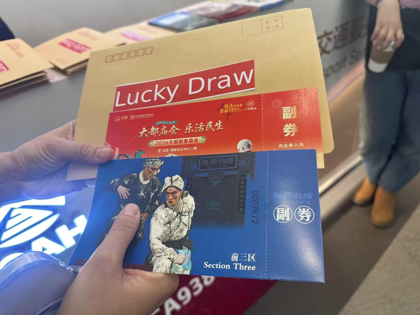 礼包里不仅有北京大都新春庙会的门票、梨园剧场的戏票,还有精品入境旅游线路折页、中旅旅行赞助的北京一日游产品,以及各式充满年味儿的小礼物。“新春大礼包”活动抽取的大奖则是一份全聚德烤鸭双人套餐。