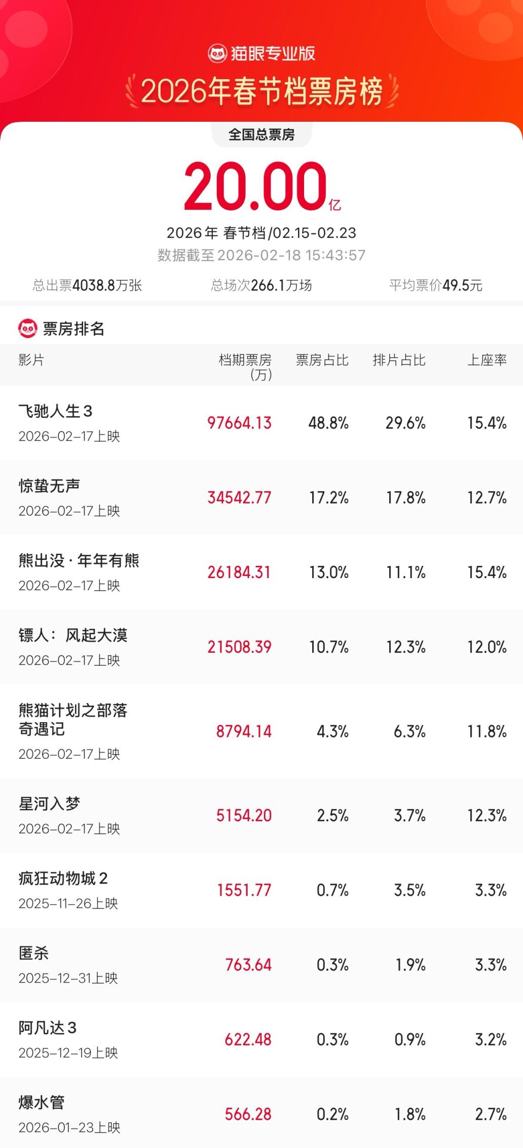 据猫眼专业版数据,截至2月18日15时43分,2026年春节档档期总票房(含预售)破20亿,《飞驰人生3》《惊蛰无声》《熊出没·年年有熊》分列前三位。