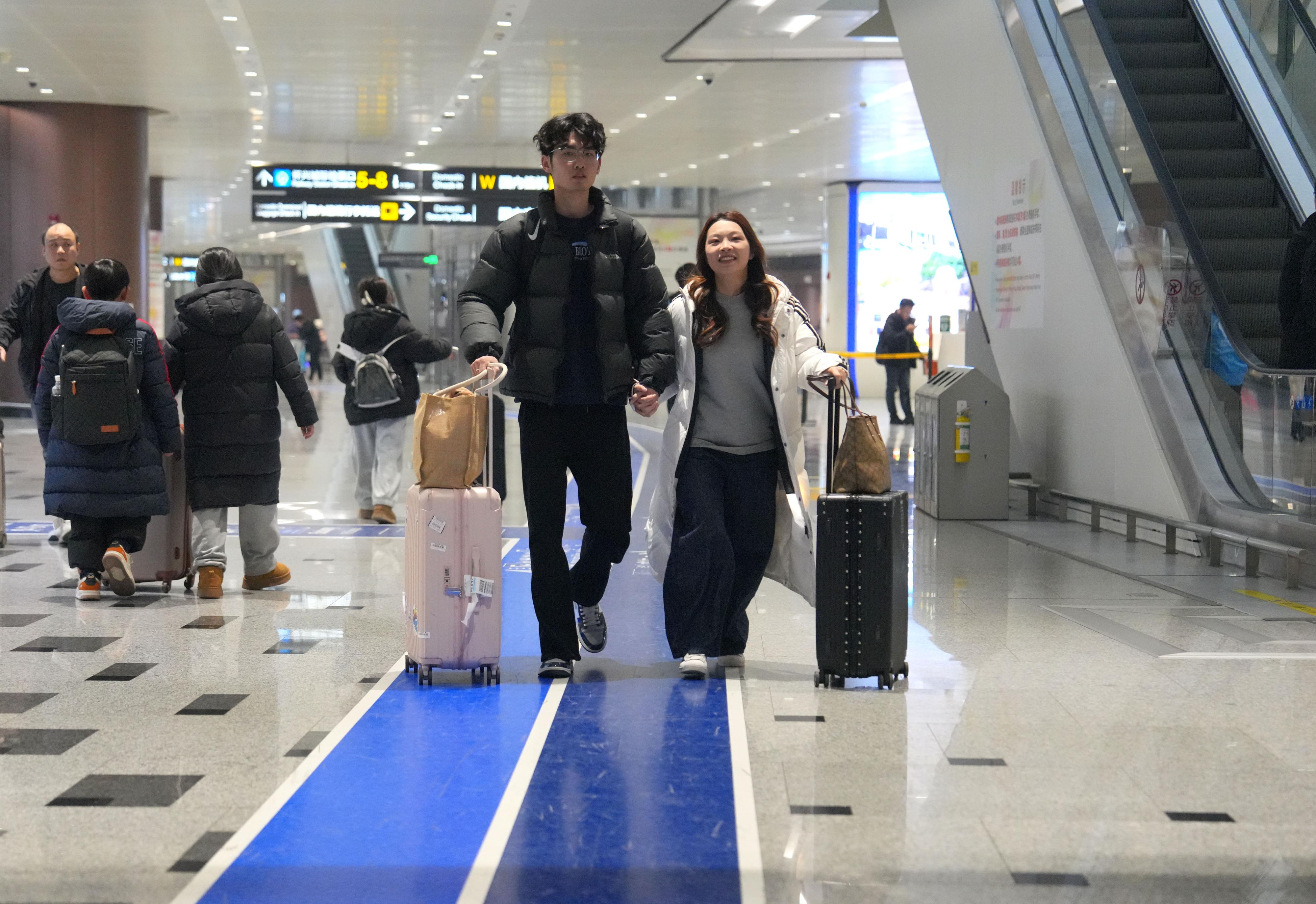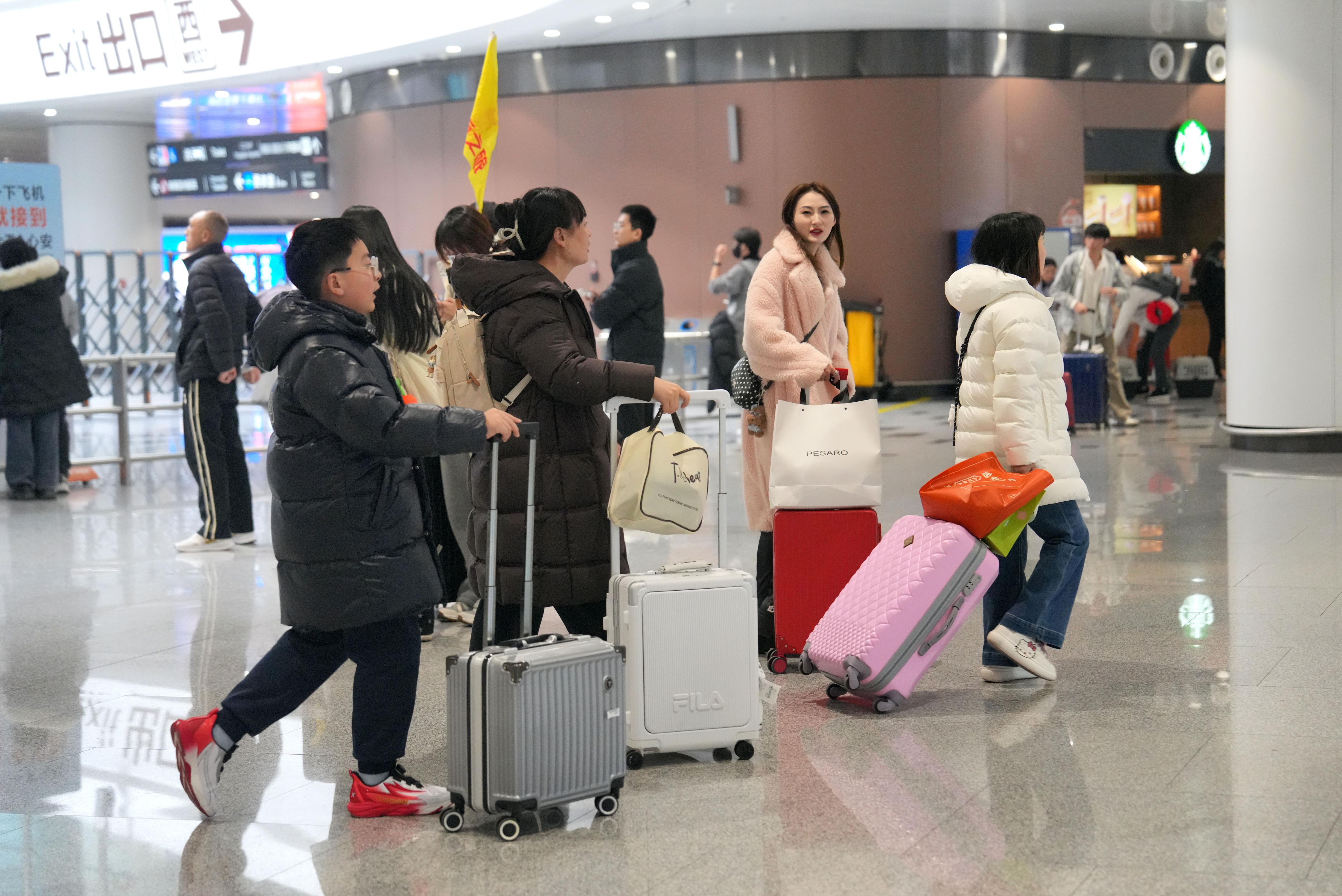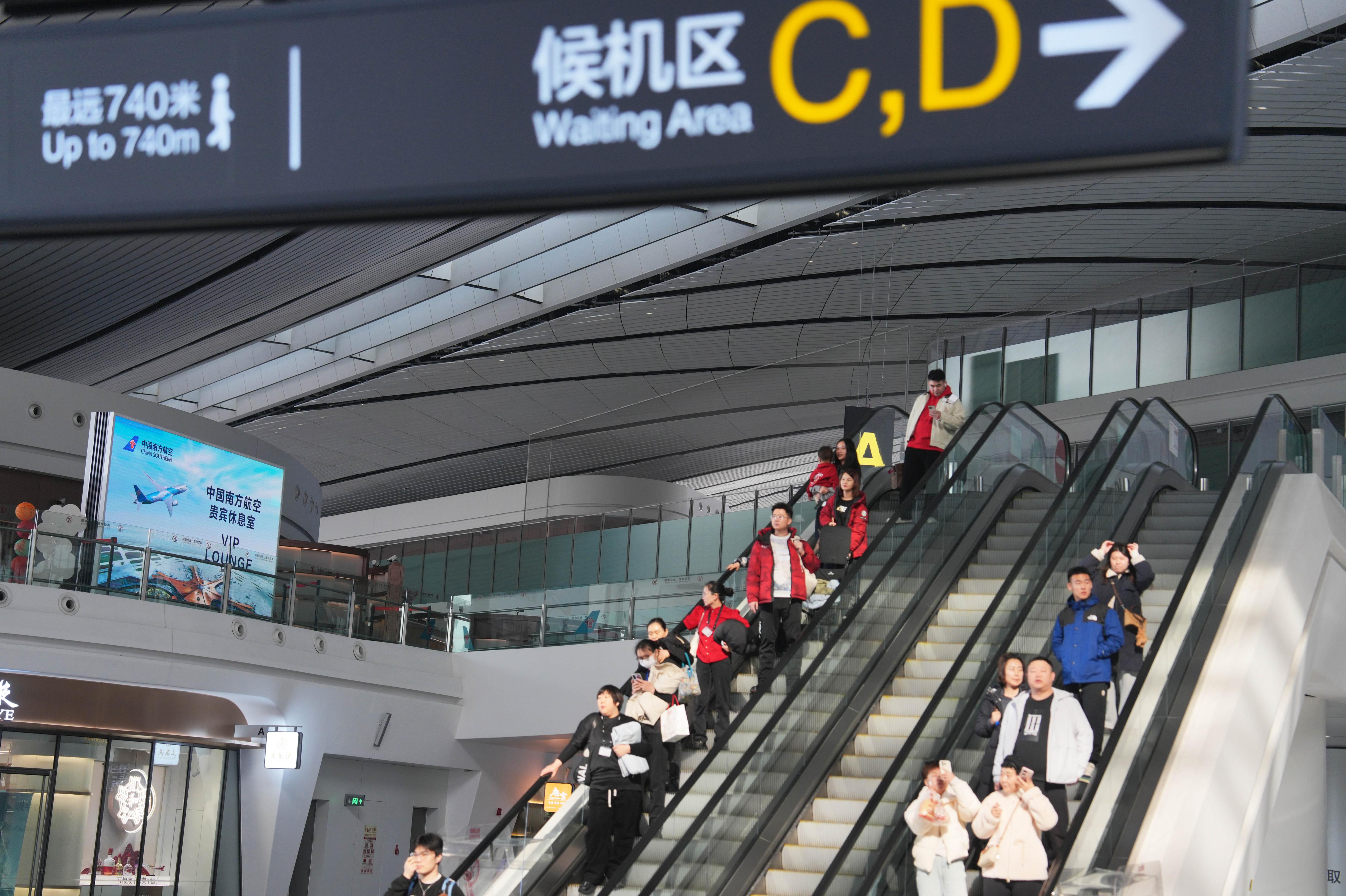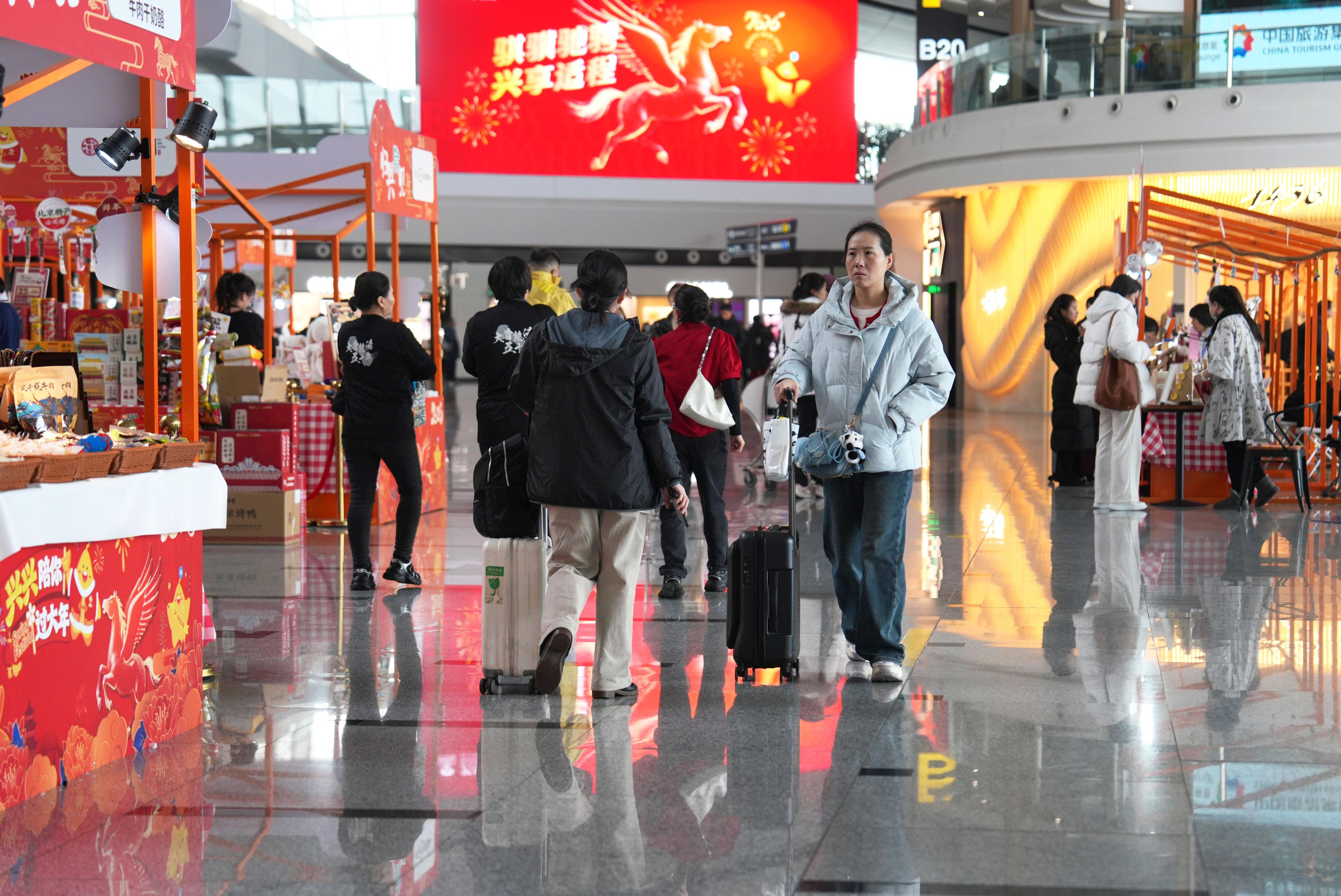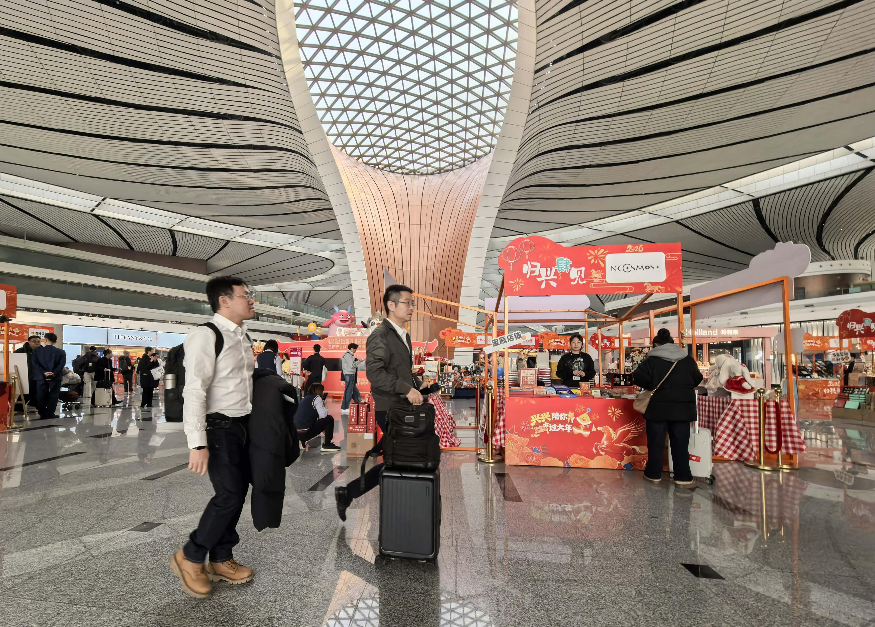 春节假期结束,北京大兴国际机场内新春装饰仍然喜气洋洋,返程旅客们面带微笑、脚步匆匆,回到各自奋斗的城市。