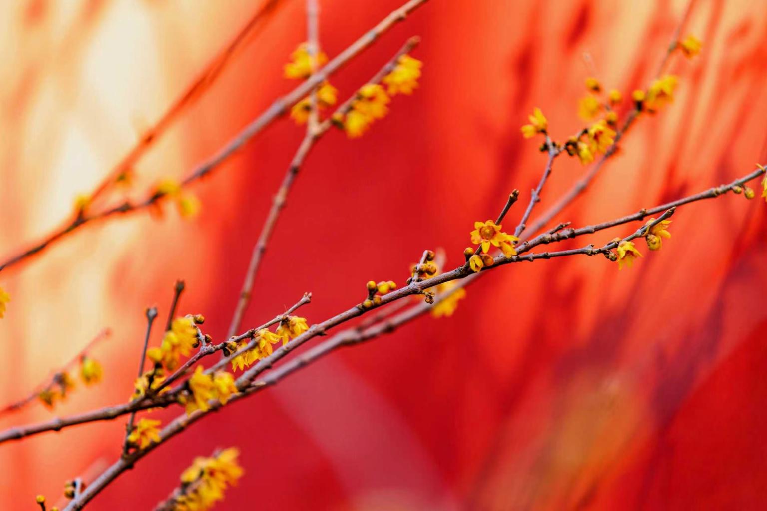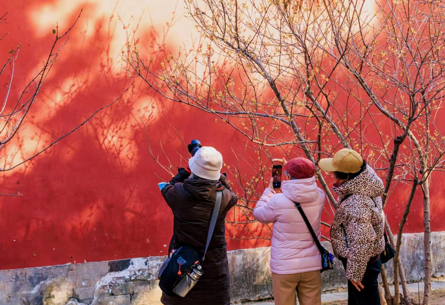 2月24日,天坛斋宫里的腊梅于寒冬绽放,其金色的花朵与朱红墙面交相辉映,令人赏心悦目。游人仍络绎不绝地来此观赏拍照。张志仁 摄