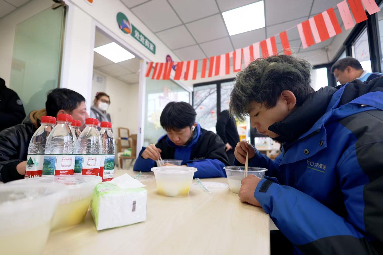 下午两点,和平东桥和美爱新驿站内暖意融融。活动邀请了30名来自一线的外卖骑手、快递员和网约车司机,其中不少是积极参与社区志愿服务的“小哥达人”和快递网点负责人。热气腾腾的元宵刚出锅,大家一边品尝着甜糯的元宵,一边开动脑筋猜灯谜。