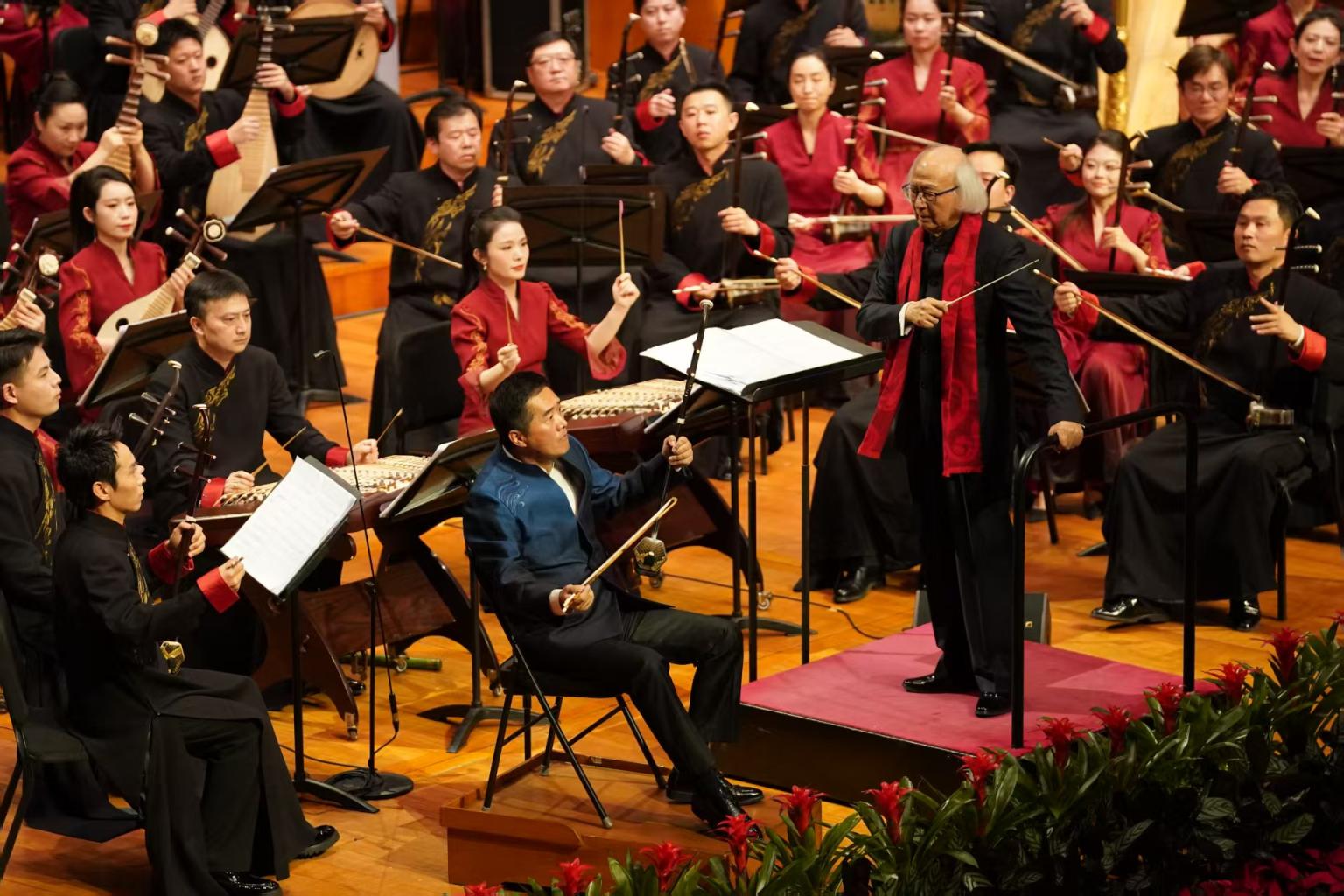 一场音乐会中,同时呈现吹、拉、弹、打四种乐器门类高难度协奏曲的曲目设置并不多见。而在这场音乐会中,中央民族乐团团长、荣誉首席唐峰,携手笛箫演奏家戴亚、打击乐演奏家王建华、古筝演奏家王中山,为观众呈现了民乐四大领域的高超水准,尽显中国民族器乐在演奏技巧方面的特色。“元宵节在中国人心中分量很重,我们特意选择了既有佳节氛围,又具技巧分量的作品。”演出开始前,唐峰介绍,希望这场音乐会让观众感受到传统文化的厚度与温度。