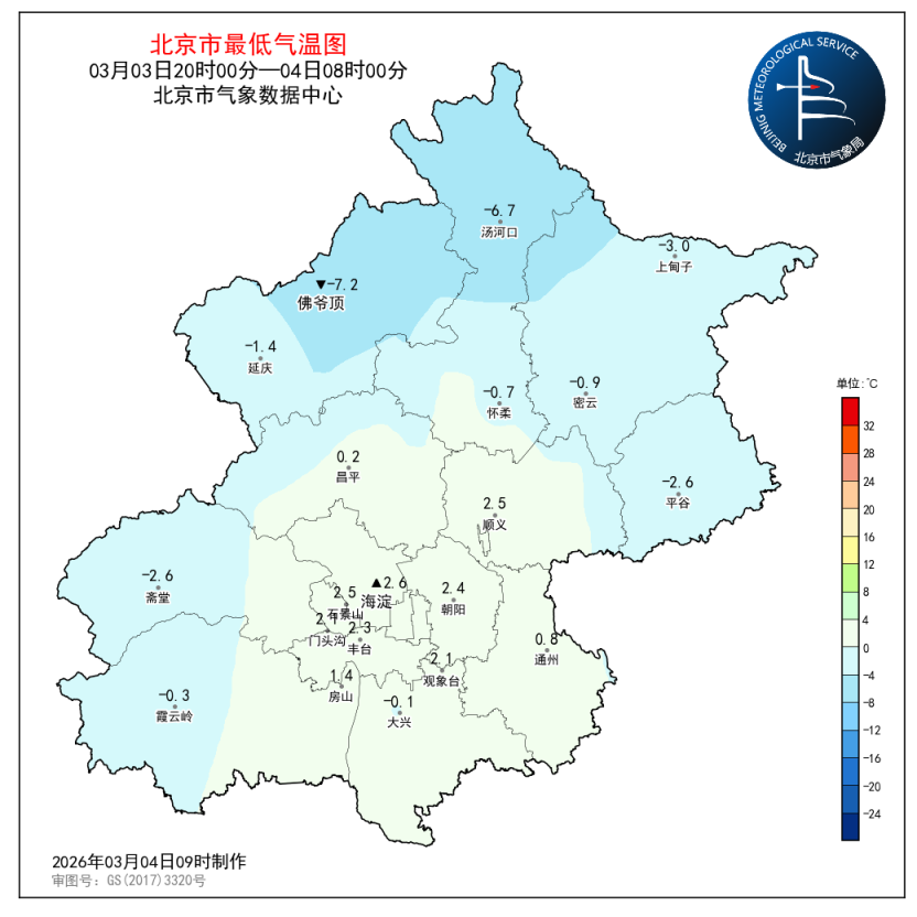 3月3日20时至4日08时,观象台最低气温2.1℃(07:44)。